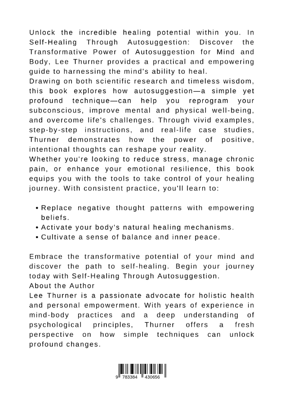 Unlock the incredible healing potential within you. In Self-Healing Through Autosuggestion: Discover the Transformative Power of Autosuggestion for Mind and Body, Lee Thurner provides a practical and empowering guide to harnessing the mind's ability to heal.Drawing on both scientific research and timeless wisdom, this book explores how autosuggestion-a simple yet profound technique-can help you reprogram your subconscious, improve mental and physical well-being, and overcome life's challenges. Through vivid examples, step-by-step instructions, and real-life case studies, Thurner demonstrates how the power of positive, intentional thoughts can reshape your reality.Whether you're looking to reduce stress, manage chronic pain, or enhance your emotional resilience, this book equips you with the tools to take control of your healing journey. With consistent practice, you'll learn to:Replace negative thought patterns with empowering beliefs.Activate your body's natural healing mechanisms.Cultivate a sense of balance and inner peace.Embrace the transformative potential of your mind and discover the path to self-healing. Begin your journey today with Self-Healing Through Autosuggestion.About the AuthorLee Thurner is a passionate advocate for holistic health and personal empowerment. With years of experience in mind-body practices and a deep understanding of psychological principles, Thurner offers a fresh perspective on how simple techniques can unlock profound changes.