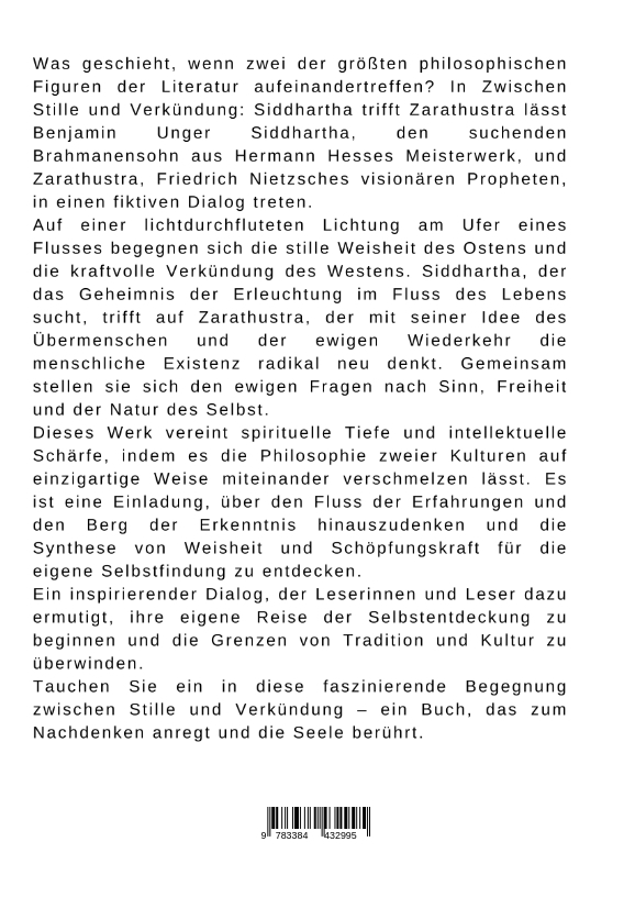 Was geschieht, wenn zwei der größten philosophischen Figuren der Literatur aufeinandertreffen? In Zwischen Stille und Verkündung: Siddhartha trifft Zarathustra lässt Benjamin Unger Siddhartha, den suchenden Brahmanensohn aus Hermann Hesses Meisterwerk, und Zarathustra, Friedrich Nietzsches visionären Propheten, in einen fiktiven Dialog treten.Auf einer lichtdurchfluteten Lichtung am Ufer eines Flusses begegnen sich die stille Weisheit des Ostens und die kraftvolle Verkündung des Westens. Siddhartha, der das Geheimnis der Erleuchtung im Fluss des Lebens sucht, trifft auf Zarathustra, der mit seiner Idee des Übermenschen und der ewigen Wiederkehr die menschliche Existenz radikal neu denkt. Gemeinsam stellen sie sich den ewigen Fragen nach Sinn, Freiheit und der Natur des Selbst.Dieses Werk vereint spirituelle Tiefe und intellektuelle Schärfe, indem es die Philosophie zweier Kulturen auf einzigartige Weise miteinander verschmelzen lässt. Es ist eine Einladung, über den Fluss der Erfahrungen und den Berg der Erkenntnis hinauszudenken und die Synthese von Weisheit und Schöpfungskraft für die eigene Selbstfindung zu entdecken.Ein inspirierender Dialog, der Leserinnen und Leser dazu ermutigt, ihre eigene Reise der Selbstentdeckung zu beginnen und die Grenzen von Tradition und Kultur zu überwinden.Tauchen Sie ein in diese faszinierende Begegnung zwischen Stille und Verkündung - ein Buch, das zum Nachdenken anregt und die Seele berührt.