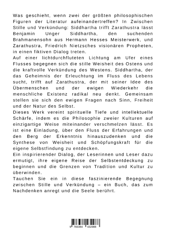 Was geschieht, wenn zwei der größten philosophischen Figuren der Literatur aufeinandertreffen? In Zwischen Stille und Verkündung: Siddhartha trifft Zarathustra lässt Benjamin Unger Siddhartha, den suchenden Brahmanensohn aus Hermann Hesses Meisterwerk, und Zarathustra, Friedrich Nietzsches visionären Propheten, in einen fiktiven Dialog treten.Auf einer lichtdurchfluteten Lichtung am Ufer eines Flusses begegnen sich die stille Weisheit des Ostens und die kraftvolle Verkündung des Westens. Siddhartha, der das Geheimnis der Erleuchtung im Fluss des Lebens sucht, trifft auf Zarathustra, der mit seiner Idee des Übermenschen und der ewigen Wiederkehr die menschliche Existenz radikal neu denkt. Gemeinsam stellen sie sich den ewigen Fragen nach Sinn, Freiheit und der Natur des Selbst.Dieses Werk vereint spirituelle Tiefe und intellektuelle Schärfe, indem es die Philosophie zweier Kulturen auf einzigartige Weise miteinander verschmelzen lässt. Es ist eine Einladung, über den Fluss der Erfahrungen und den Berg der Erkenntnis hinauszudenken und die Synthese von Weisheit und Schöpfungskraft für die eigene Selbstfindung zu entdecken.Ein inspirierender Dialog, der Leserinnen und Leser dazu ermutigt, ihre eigene Reise der Selbstentdeckung zu beginnen und die Grenzen von Tradition und Kultur zu überwinden.Tauchen Sie ein in diese faszinierende Begegnung zwischen Stille und Verkündung - ein Buch, das zum Nachdenken anregt und die Seele berührt.