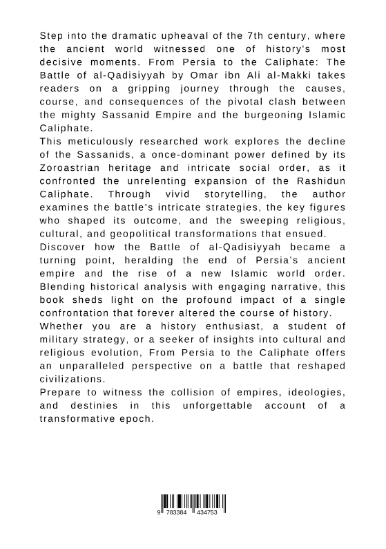 Step into the dramatic upheaval of the 7th century, where the ancient world witnessed one of history's most decisive moments. From Persia to the Caliphate: The Battle of al-Qadisiyyah by Omar ibn Ali al-Makki takes readers on a gripping journey through the causes, course, and consequences of the pivotal clash between the mighty Sassanid Empire and the burgeoning Islamic Caliphate.This meticulously researched work explores the decline of the Sassanids, a once-dominant power defined by its Zoroastrian heritage and intricate social order, as it confronted the unrelenting expansion of the Rashidun Caliphate. Through vivid storytelling, the author examines the battle's intricate strategies, the key figures who shaped its outcome, and the sweeping religious, cultural, and geopolitical transformations that ensued.Discover how the Battle of al-Qadisiyyah became a turning point, heralding the end of Persia's ancient empire and the rise of a new Islamic world order. Blending historical analysis with engaging narrative, this book sheds light on the profound impact of a single confrontation that forever altered the course of history.Whether you are a history enthusiast, a student of military strategy, or a seeker of insights into cultural and religious evolution, From Persia to the Caliphate offers an unparalleled perspective on a battle that reshaped civilizations.Prepare to witness the collision of empires, ideologies, and destinies in this unforgettable account of a transformative epoch.