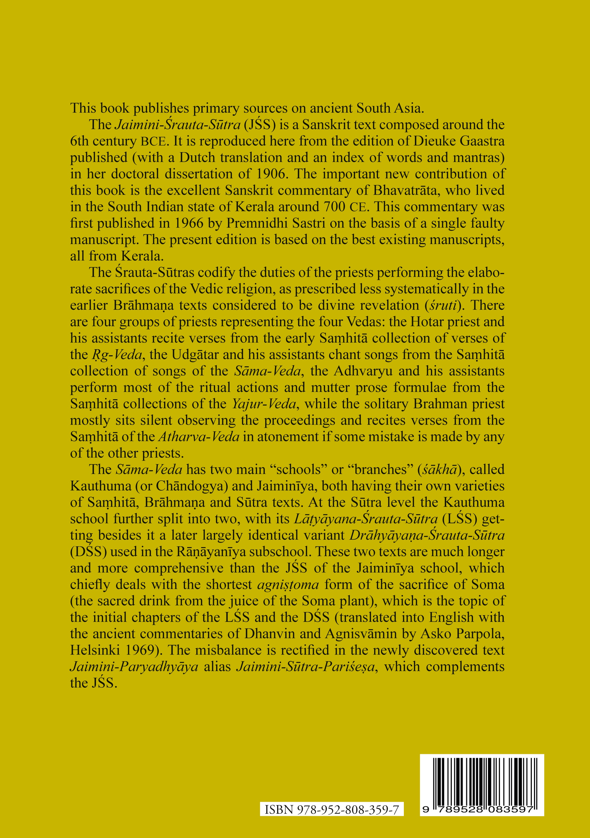 The Jaimini-Srauta-Sutra is a Sanskrit text composed around the 6th century BCE. The important new contribution of this book is the excellent Sanskrit commentary of Bhavatrata, who lived in the South Indian state of Kerala around 700 CE.