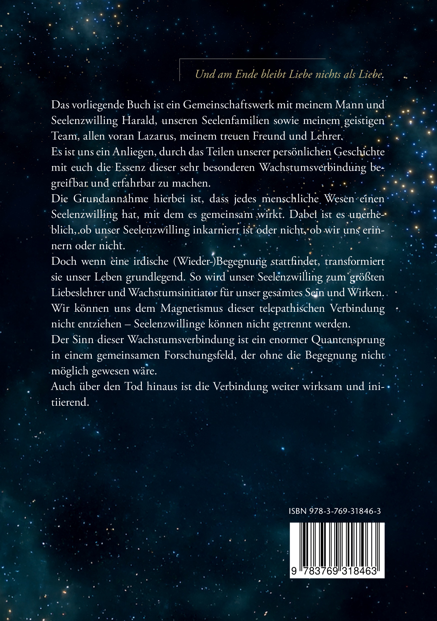Das vorliegende Buch ist ein Gemeinschaftswerk mit meinem Mann und Seelenzwilling Harald, unseren Seelenfamilien sowie meinem geistigen Team, allen voran Lazarus, meinem treuen Freund und Lehrer.