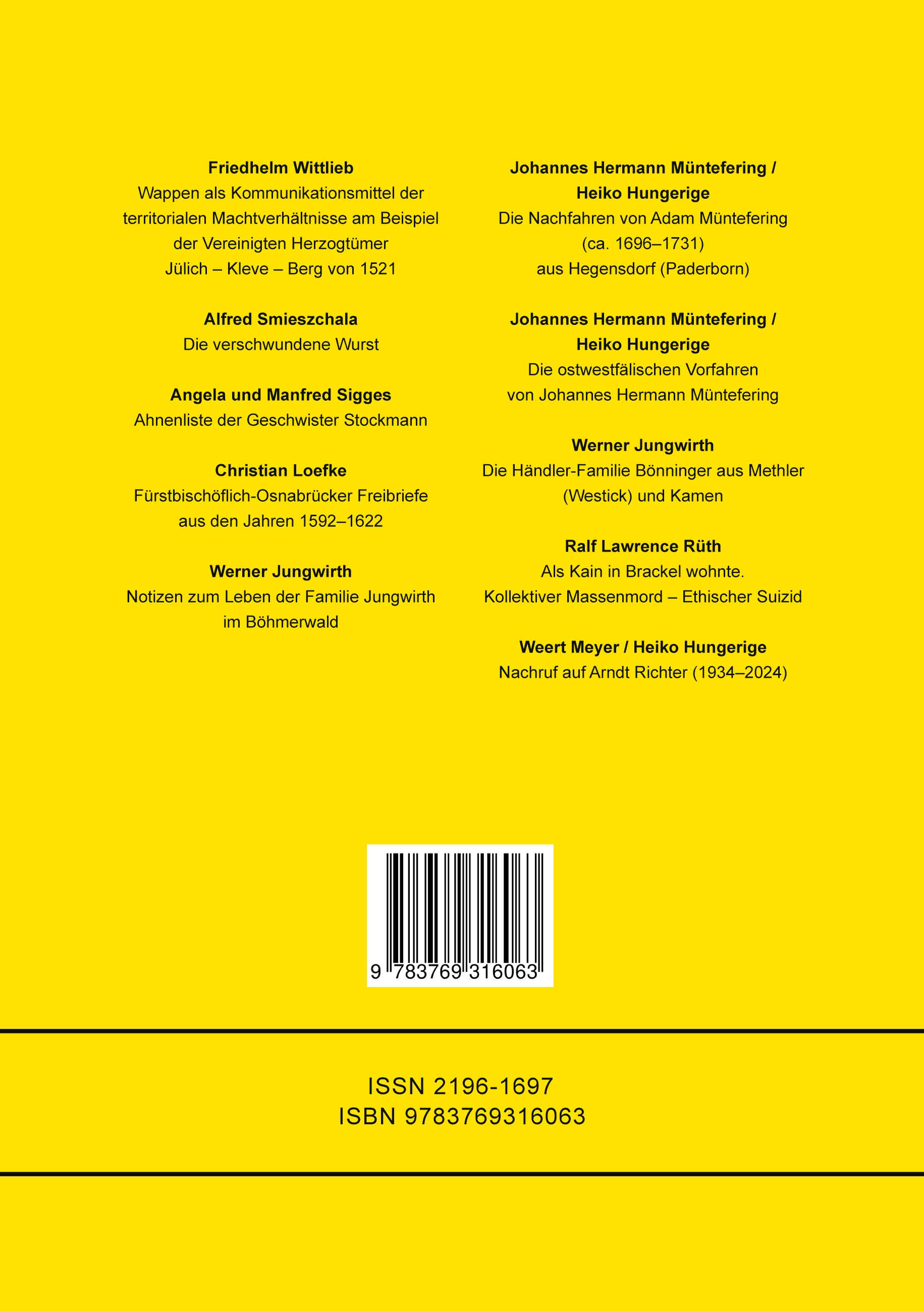 Der vorliegende Jahresband des Roland zu Dortmund e.V.. wird eingeleitet durch eine Untersuchung von Friedhelm Wittlieb zu "Wappen als Kommunikationsmittel". Angela und Manfred Sigges haben die "Ahnenliste der Geschwister Stockmann" bearbeitet, während Johannes H. Müntefering und Heiko Hungerige sich den "ostwestfälischen Vorfahren des Johannes Hermann Müntefering" angenommen haben. Diese beiden zeichnen auch für die Nachfahrenliste des Adam Müntefering aus Hegensdorf verantwortlich. Die "Fürstbischöflich-Osnabrücker Freibrief aus den Jahren 1592 - 1622" hat Christian Loefke zusammengestellt. Zwei Artikel von Werner Jungwirth befassen sich mit der Familie Jungwirth aus dem Böhmerwald und "der Händler-Familie Bönninger aus Methler". Ralf L. Rüth beleuchtet die NS-Zeit und deren Aufarbeitung in der jungen Bundesrepublik am Beispiel des Dortmunder Stadtteils Brackel. Etwas Lustiges berichtet Alfred Smieszchala über eine verschwundene Wurst. Zum Schluss gedenken Weert Meyer und Heiko Hungerige dem verstorbenen Familienforscher Arndt Richter.