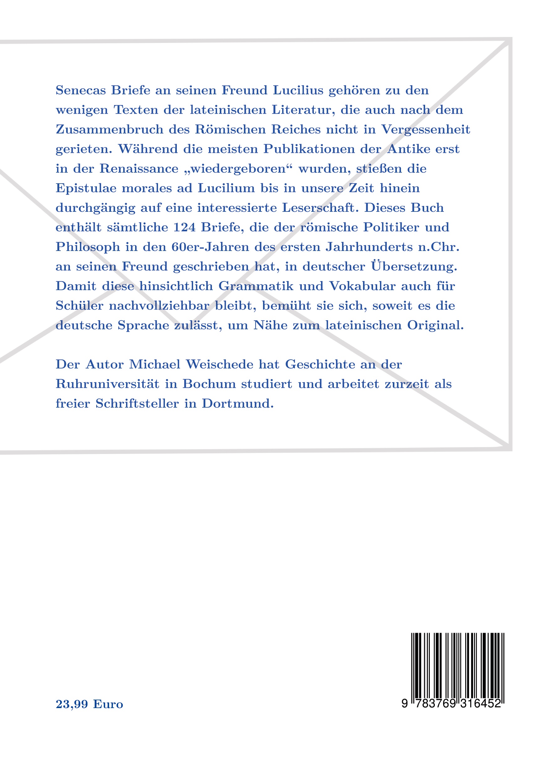 Senecas Briefe an seinen Freund Lucilius gehören zu den wenigen Texten der lateinischen Literatur, die auch nach dem Zusammenbruch des Römischen Reiches nicht in Vergessenheit gerieten. Während die meisten Publikationen der Antike erst in der Renaissance "wiedergeboren" wurden, stießen die Epistulae morales ad Lucilium bis in unsere Zeit hinein durchgängig auf eine interessierte Leserschaft. Dieses Buch enthält sämtliche 124 Briefe, die der römische Politiker und Philosoph in den 60er-Jahren des ersten Jahrhunderts n.Chr. an seinen Freund geschrieben hat, in deutscher Übersetzung. Damit diese hinsichtlich Grammatik und Vokabular auch für Schüler nachvollziehbar bleibt, bemüht sie sich, soweit es die deutsche Sprache zulässt, um Nähe zum lateinischen Original.