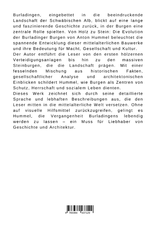 Burladingen, eingebettet in die beeindruckende Landschaft der Schwäbischen Alb, blickt auf eine lange und faszinierende Geschichte zurück, in der Burgen eine zentrale Rolle spielten. Von Holz zu Stein: Die Evolution der Burladinger Burgen von Anton Hummel beleuchtet die spannende Entwicklung dieser mittelalterlichen Bauwerke und ihre Bedeutung für Macht, Gesellschaft und Kultur.Der Autor entführt die Leser von den ersten hölzernen Verteidigungsanlagen bis hin zu den massiven Steinburgen, die die Landschaft prägen. Mit einer fesselnden Mischung aus historischen Fakten, gesellschaftlicher Analyse und architektonischen Einblicken schildert Hummel, wie Burgen als Zentren von Schutz, Herrschaft und sozialem Leben dienten.Dieses Werk zeichnet sich durch seine detaillierte Sprache und lebhaften Beschreibungen aus, die den Leser mitten in die mittelalterliche Welt versetzen. Ohne auf visuelle Hilfsmittel zurückzugreifen, gelingt es Hummel, die Vergangenheit Burladingens lebendig werden zu lassen - ein Muss für Liebhaber von Geschichte und Architektur.
