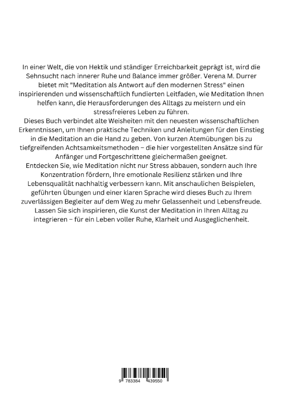 In einer Welt, die von Hektik und ständiger Erreichbarkeit geprägt ist, wird die Sehnsucht nach innerer Ruhe und Balance immer größer. Verena M. Durrer bietet mit "Meditation als Antwort auf den modernen Stress" einen inspirierenden und wissenschaftlich fundierten Leitfaden, wie Meditation Ihnen helfen kann, die Herausforderungen des Alltags zu meistern und ein stressfreieres Leben zu führen.Dieses Buch verbindet alte Weisheiten mit den neuesten wissenschaftlichen Erkenntnissen, um Ihnen praktische Techniken und Anleitungen für den Einstieg in die Meditation an die Hand zu geben. Von kurzen Atemübungen bis zu tiefgreifenden Achtsamkeitsmethoden - die hier vorgestellten Ansätze sind für Anfänger und Fortgeschrittene gleichermaßen geeignet.Entdecken Sie, wie Meditation nicht nur Stress abbauen, sondern auch Ihre Konzentration fördern, Ihre emotionale Resilienz stärken und Ihre Lebensqualität nachhaltig verbessern kann. Mit anschaulichen Beispielen, geführten Übungen und einer klaren Sprache wird dieses Buch zu Ihrem zuverlässigen Begleiter auf dem Weg zu mehr Gelassenheit und Lebensfreude.Lassen Sie sich inspirieren, die Kunst der Meditation in Ihren Alltag zu integrieren - für ein Leben voller Ruhe, Klarheit und Ausgeglichenheit.