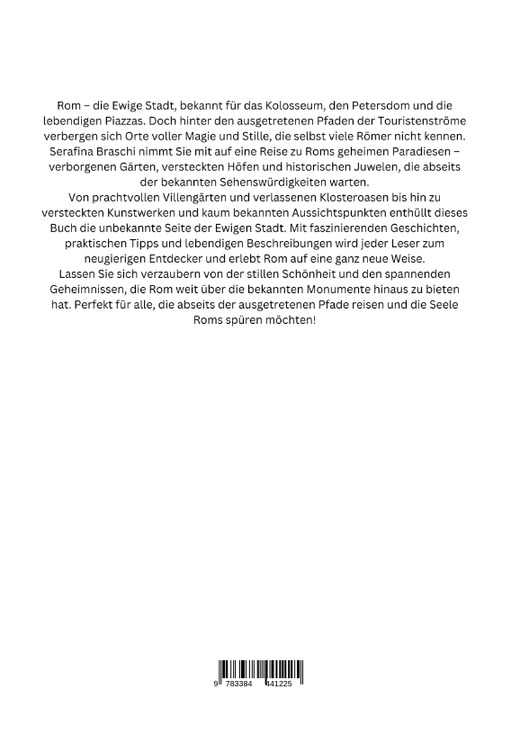 Rom - die Ewige Stadt, bekannt für das Kolosseum, den Petersdom und die lebendigen Piazzas. Doch hinter den ausgetretenen Pfaden der Touristenströme verbergen sich Orte voller Magie und Stille, die selbst viele Römer nicht kennen. Serafina Braschi nimmt Sie mit auf eine Reise zu Roms geheimen Paradiesen - verborgenen Gärten, versteckten Höfen und historischen Juwelen, die abseits der bekannten Sehenswürdigkeiten warten.Von prachtvollen Villengärten und verlassenen Klosteroasen bis hin zu versteckten Kunstwerken und kaum bekannten Aussichtspunkten enthüllt dieses Buch die unbekannte Seite der Ewigen Stadt. Mit faszinierenden Geschichten, praktischen Tipps und lebendigen Beschreibungen wird jeder Leser zum neugierigen Entdecker und erlebt Rom auf eine ganz neue Weise.Lassen Sie sich verzaubern von der stillen Schönheit und den spannenden Geheimnissen, die Rom weit über die bekannten Monumente hinaus zu bieten hat. Perfekt für alle, die abseits der ausgetretenen Pfade reisen und die Seele Roms spüren möchten!