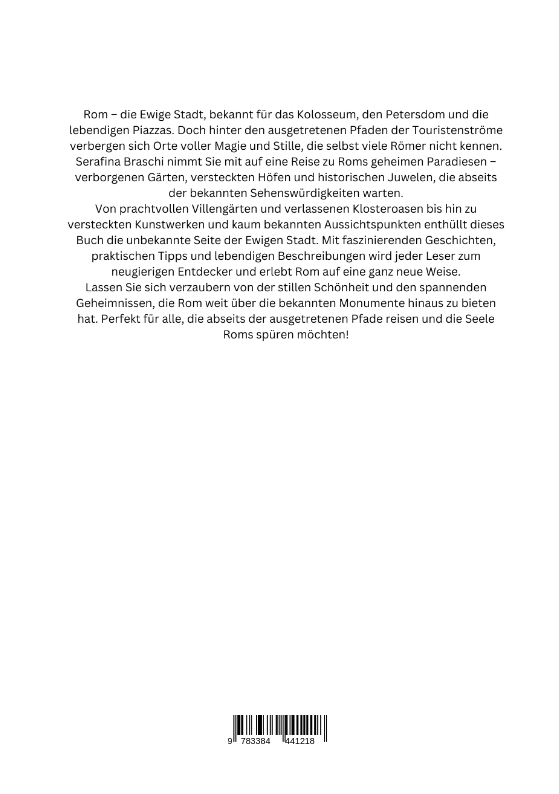 Rom - die Ewige Stadt, bekannt für das Kolosseum, den Petersdom und die lebendigen Piazzas. Doch hinter den ausgetretenen Pfaden der Touristenströme verbergen sich Orte voller Magie und Stille, die selbst viele Römer nicht kennen. Serafina Braschi nimmt Sie mit auf eine Reise zu Roms geheimen Paradiesen - verborgenen Gärten, versteckten Höfen und historischen Juwelen, die abseits der bekannten Sehenswürdigkeiten warten.Von prachtvollen Villengärten und verlassenen Klosteroasen bis hin zu versteckten Kunstwerken und kaum bekannten Aussichtspunkten enthüllt dieses Buch die unbekannte Seite der Ewigen Stadt. Mit faszinierenden Geschichten, praktischen Tipps und lebendigen Beschreibungen wird jeder Leser zum neugierigen Entdecker und erlebt Rom auf eine ganz neue Weise.Lassen Sie sich verzaubern von der stillen Schönheit und den spannenden Geheimnissen, die Rom weit über die bekannten Monumente hinaus zu bieten hat. Perfekt für alle, die abseits der ausgetretenen Pfade reisen und die Seele Roms spüren möchten!