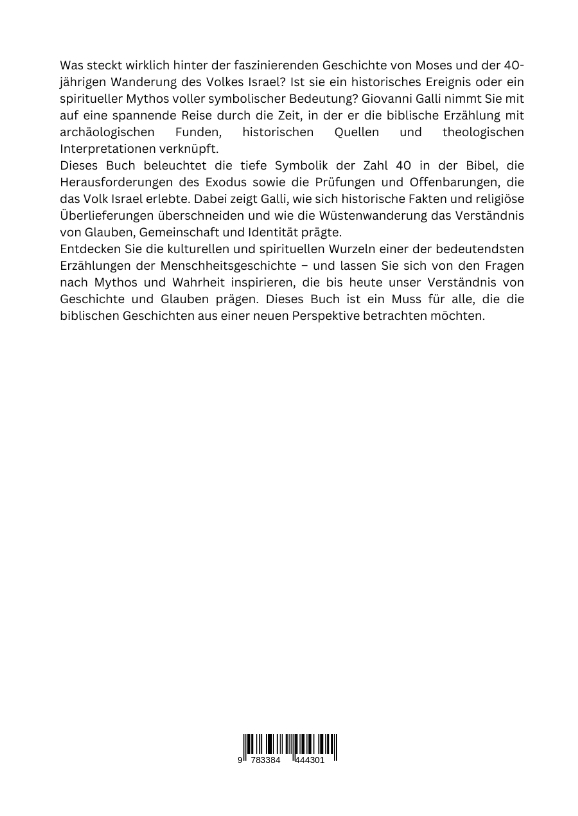 Was steckt wirklich hinter der faszinierenden Geschichte von Moses und der 40-jährigen Wanderung des Volkes Israel? Ist sie ein historisches Ereignis oder ein spiritueller Mythos voller symbolischer Bedeutung? Giovanni Galli nimmt Sie mit auf eine spannende Reise durch die Zeit, in der er die biblische Erzählung mit archäologischen Funden, historischen Quellen und theologischen Interpretationen verknüpft.Dieses Buch beleuchtet die tiefe Symbolik der Zahl 40 in der Bibel, die Herausforderungen des Exodus sowie die Prüfungen und Offenbarungen, die das Volk Israel erlebte. Dabei zeigt Galli, wie sich historische Fakten und religiöse Überlieferungen überschneiden und wie die Wüstenwanderung das Verständnis von Glauben, Gemeinschaft und Identität prägte.Entdecken Sie die kulturellen und spirituellen Wurzeln einer der bedeutendsten Erzählungen der Menschheitsgeschichte - und lassen Sie sich von den Fragen nach Mythos und Wahrheit inspirieren, die bis heute unser Verständnis von Geschichte und Glauben prägen. Dieses Buch ist ein Muss für alle, die die biblischen Geschichten aus einer neuen Perspektive betrachten möchten.