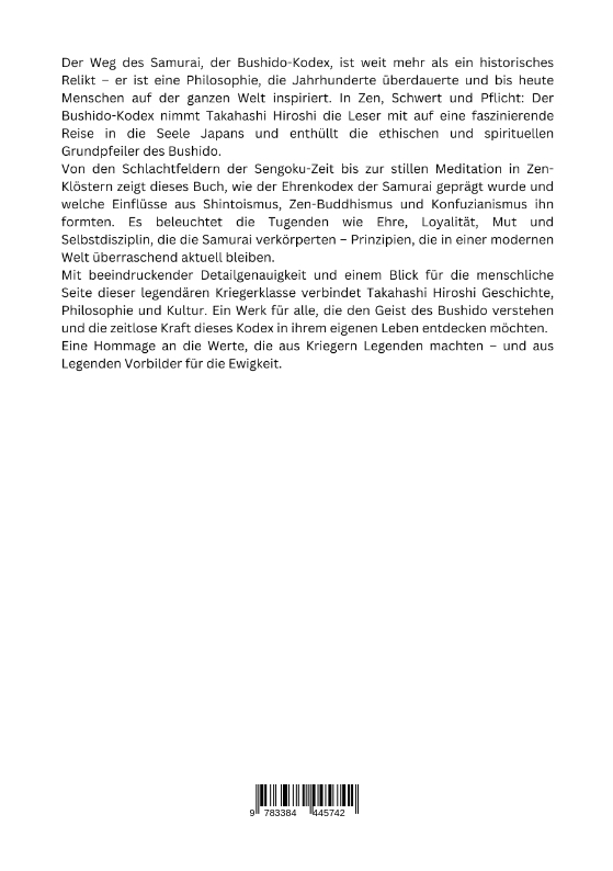 Der Weg des Samurai, der Bushido-Kodex, ist weit mehr als ein historisches Relikt - er ist eine Philosophie, die Jahrhunderte überdauerte und bis heute Menschen auf der ganzen Welt inspiriert. In Zen, Schwert und Pflicht: Der Bushido-Kodex nimmt Takahashi Hiroshi die Leser mit auf eine faszinierende Reise in die Seele Japans und enthüllt die ethischen und spirituellen Grundpfeiler des Bushido.Von den Schlachtfeldern der Sengoku-Zeit bis zur stillen Meditation in Zen-Klöstern zeigt dieses Buch, wie der Ehrenkodex der Samurai geprägt wurde und welche Einflüsse aus Shintoismus, Zen-Buddhismus und Konfuzianismus ihn formten. Es beleuchtet die Tugenden wie Ehre, Loyalität, Mut und Selbstdisziplin, die die Samurai verkörperten - Prinzipien, die in einer modernen Welt überraschend aktuell bleiben.Mit beeindruckender Detailgenauigkeit und einem Blick für die menschliche Seite dieser legendären Kriegerklasse verbindet Takahashi Hiroshi Geschichte, Philosophie und Kultur. Ein Werk für alle, die den Geist des Bushido verstehen und die zeitlose Kraft dieses Kodex in ihrem eigenen Leben entdecken möchten.Eine Hommage an die Werte, die aus Kriegern Legenden machten - und aus Legenden Vorbilder für die Ewigkeit.