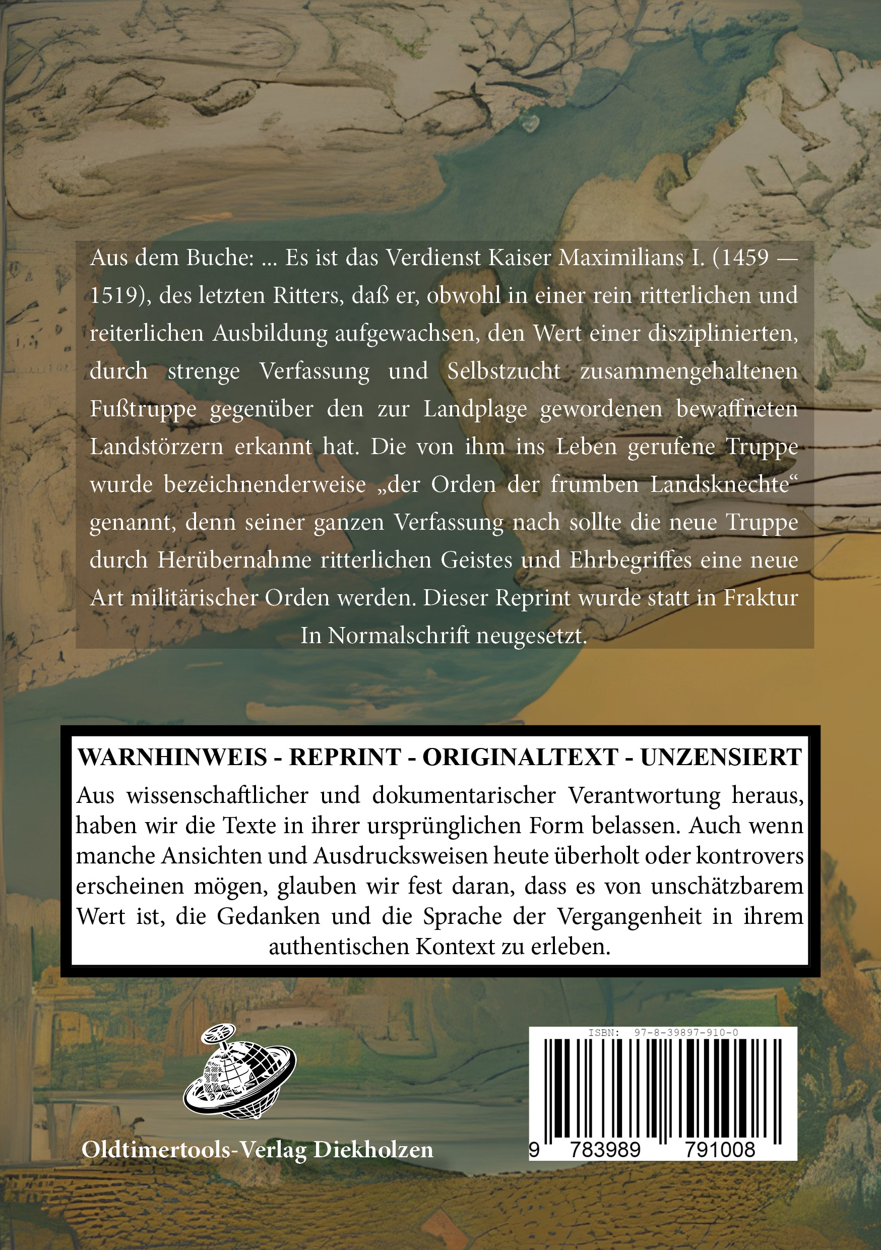 Aus dem Buche: ... Es ist das Verdienst Kaiser Maximilians I. (1459 - 1519), des letzten Ritters, daß er, obwohl in einer rein ritterlichen und reiterlichen Ausbildung aufgewachsen, den Wert einer disziplinierten, durch strenge Verfassung und Selbstzucht zusammengehaltenen Fußtruppe gegenüber den zur Landplage gewordenen bewaffneten Landstörzern erkannt hat. Die von ihm ins Leben gerufene Truppe wurde bezeichnenderweise "der Orden der frumben Landsknechte" genannt, denn seiner ganzen Verfassung nach sollte die neue Truppe durch Herübernahme ritterlichen Geistes und Ehrbegriffes eine neue Art militärischer Orden werden. Dieser Reprint wurde statt in Fraktur In Normalschrift neugesetzt.