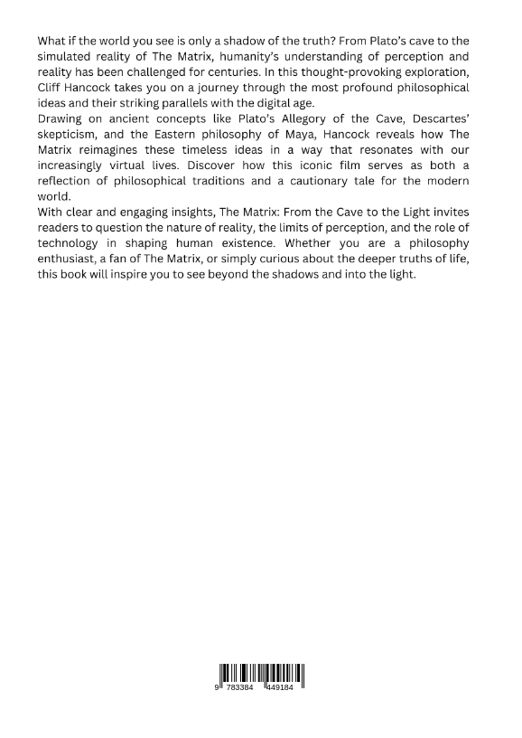 What if the world you see is only a shadow of the truth? From Plato's cave to the simulated reality of The Matrix, humanity's understanding of perception and reality has been challenged for centuries. In this thought-provoking exploration, Cliff Hancock takes you on a journey through the most profound philosophical ideas and their striking parallels with the digital age.Drawing on ancient concepts like Plato's Allegory of the Cave, Descartes' skepticism, and the Eastern philosophy of Maya, Hancock reveals how The Matrix reimagines these timeless ideas in a way that resonates with our increasingly virtual lives. Discover how this iconic film serves as both a reflection of philosophical traditions and a cautionary tale for the modern world.With clear and engaging insights, The Matrix: From the Cave to the Light invites readers to question the nature of reality, the limits of perception, and the role of technology in shaping human existence. Whether you are a philosophy enthusiast, a fan of The Matrix, or simply curious about the deeper truths of life, this book will inspire you to see beyond the shadows and into the light.