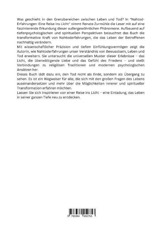 Was geschieht in den Grenzbereichen zwischen Leben und Tod? In "Nahtod-Erfahrungen: Eine Reise ins Licht" nimmt Renate Zurmühle die Leser mit auf eine faszinierende Erkundung dieser außergewöhnlichen Phänomene. Aufbauend auf tiefenpsychologischen und spirituellen Perspektiven beleuchtet das Buch die transformative Kraft von Nahtoderfahrungen, die das Leben der Betroffenen nachhaltig verändern.Mit wissenschaftlicher Präzision und tiefem Einfühlungsvermögen zeigt die Autorin, wie Nahtoderfahrungen unser Verständnis von Bewusstsein, Leben und Tod erweitern. Sie untersucht die universellen Muster dieser Erlebnisse - das Licht, die überwältigende Liebe und das Gefühl des Friedens - und stellt Verbindungen zu religiösen Traditionen und modernen psychologischen Ansätzen her.Dieses Buch lädt dazu ein, den Tod nicht als Ende, sondern als Übergang zu sehen. Es ist ein Wegweiser für alle, die sich mit den großen Fragen des Lebens auseinandersetzen und mehr über die Möglichkeiten innerer und spiritueller Transformation erfahren möchten.Lassen Sie sich inspirieren von einer Reise ins Licht - eine Einladung, das Leben in seiner ganzen Tiefe neu zu entdecken.