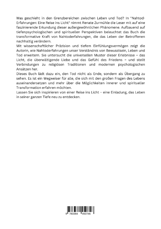 Was geschieht in den Grenzbereichen zwischen Leben und Tod? In "Nahtod-Erfahrungen: Eine Reise ins Licht" nimmt Renate Zurmühle die Leser mit auf eine faszinierende Erkundung dieser außergewöhnlichen Phänomene. Aufbauend auf tiefenpsychologischen und spirituellen Perspektiven beleuchtet das Buch die transformative Kraft von Nahtoderfahrungen, die das Leben der Betroffenen nachhaltig verändern.Mit wissenschaftlicher Präzision und tiefem Einfühlungsvermögen zeigt die Autorin, wie Nahtoderfahrungen unser Verständnis von Bewusstsein, Leben und Tod erweitern. Sie untersucht die universellen Muster dieser Erlebnisse - das Licht, die überwältigende Liebe und das Gefühl des Friedens - und stellt Verbindungen zu religiösen Traditionen und modernen psychologischen Ansätzen her.Dieses Buch lädt dazu ein, den Tod nicht als Ende, sondern als Übergang zu sehen. Es ist ein Wegweiser für alle, die sich mit den großen Fragen des Lebens auseinandersetzen und mehr über die Möglichkeiten innerer und spiritueller Transformation erfahren möchten.Lassen Sie sich inspirieren von einer Reise ins Licht - eine Einladung, das Leben in seiner ganzen Tiefe neu zu entdecken.