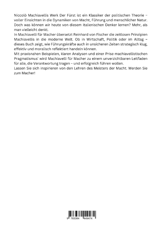 Macht. Strategie. Erfolg.Niccolò Machiavellis Werk Der Fürst ist ein Klassiker der politischen Theorie - voller Einsichten in die Dynamiken von Macht, Führung und menschlicher Natur. Doch was können wir heute von diesem italienischen Denker lernen? Mehr, als man vielleicht denkt.In Machiavelli für Macher übersetzt Reinhard von Fischer die zeitlosen Prinzipien Machiavellis in die moderne Welt. Ob in Wirtschaft, Politik oder im Alltag - dieses Buch zeigt, wie Führungskräfte auch in unsicheren Zeiten strategisch klug, effektiv und moralisch reflektiert handeln können.Mit praxisnahen Beispielen, klaren Analysen und einer Prise machiavellistischen Pragmatismus' wird Machiavelli für Macher zu einem unverzichtbaren Leitfaden für alle, die Verantwortung tragen - und erfolgreich führen wollen.Lassen Sie sich inspirieren von den Lehren des Meisters der Macht. Werden Sie zum Macher!