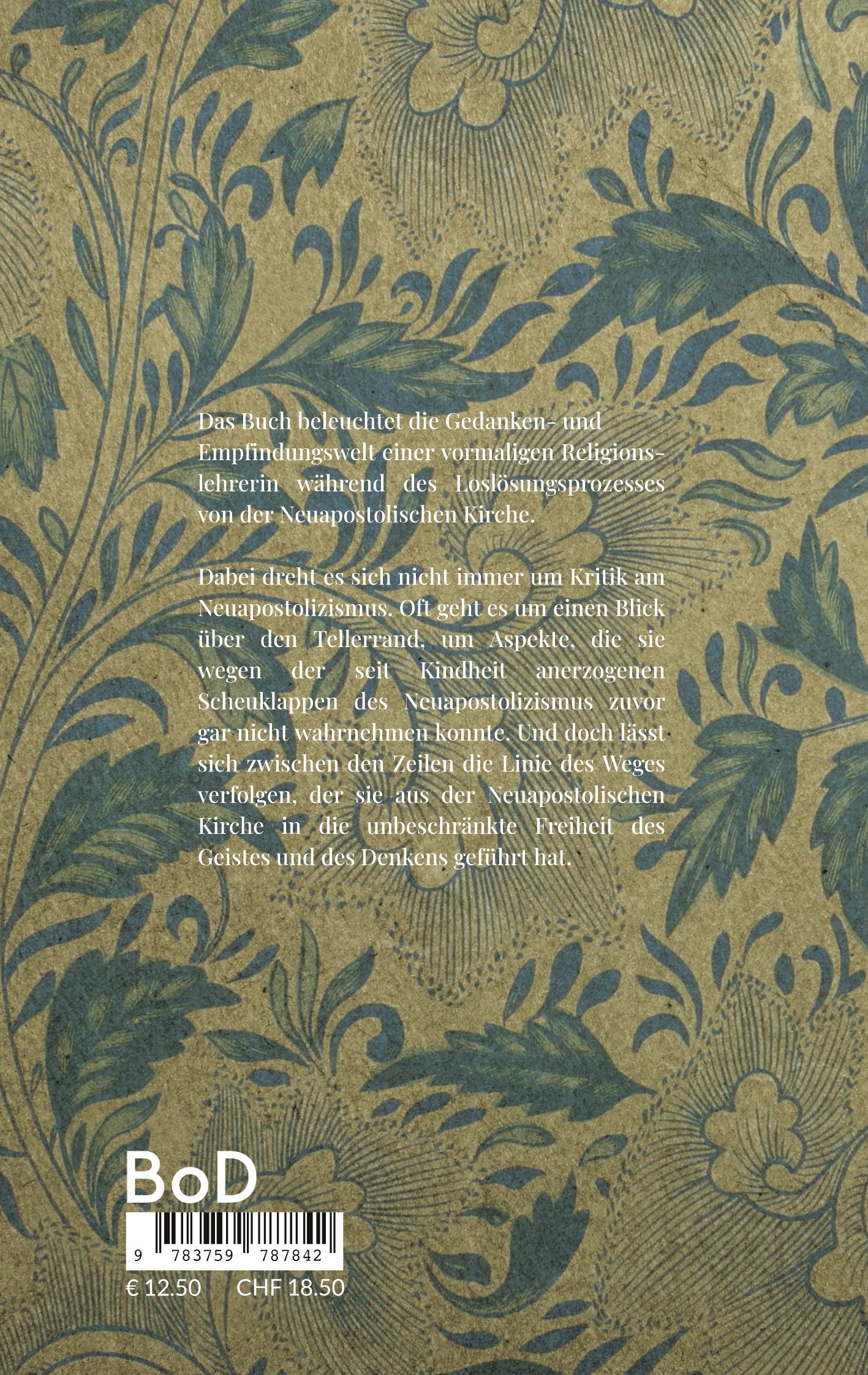 Dabei dreht es sich nicht immer nur Kritik am Neuapostolizismus. Oft geht es um einen Blick über den Tellerrand, um Aspekte, die sie wegen der seit Kindheit anerzogenen Scheuklappen des Neuapostolizismus zuvor gar nicht wahrnehmen konnte. Und doch lässt sich zwischen den Zeilen die Linie des Weges verfolgen, der sie aus der Neuapostolischen Kirche in die unbeschränkte Freiheit des Geistes und des Denkens geführt hat.