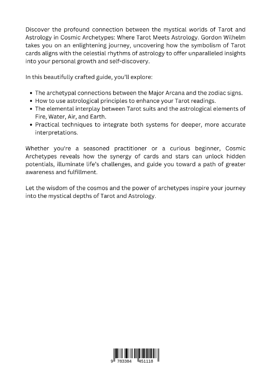 Discover the profound connection between the mystical worlds of Tarot and Astrology in Cosmic Archetypes: Where Tarot Meets Astrology. Gordon Wilhelm takes you on an enlightening journey, uncovering how the symbolism of Tarot cards aligns with the celestial rhythms of astrology to offer unparalleled insights into your personal growth and self-discovery.In this beautifully crafted guide, you'll explore:The archetypal connections between the Major Arcana and the zodiac signs.How to use astrological principles to enhance your Tarot readings.The elemental interplay between Tarot suits and the astrological elements of Fire, Water, Air, and Earth.Practical techniques to integrate both systems for deeper, more accurate interpretations.Whether you're a seasoned practitioner or a curious beginner, Cosmic Archetypes reveals how the synergy of cards and stars can unlock hidden potentials, illuminate life's challenges, and guide you toward a path of greater awareness and fulfillment.Let the wisdom of the cosmos and the power of archetypes inspire your journey into the mystical depths of Tarot and Astrology.