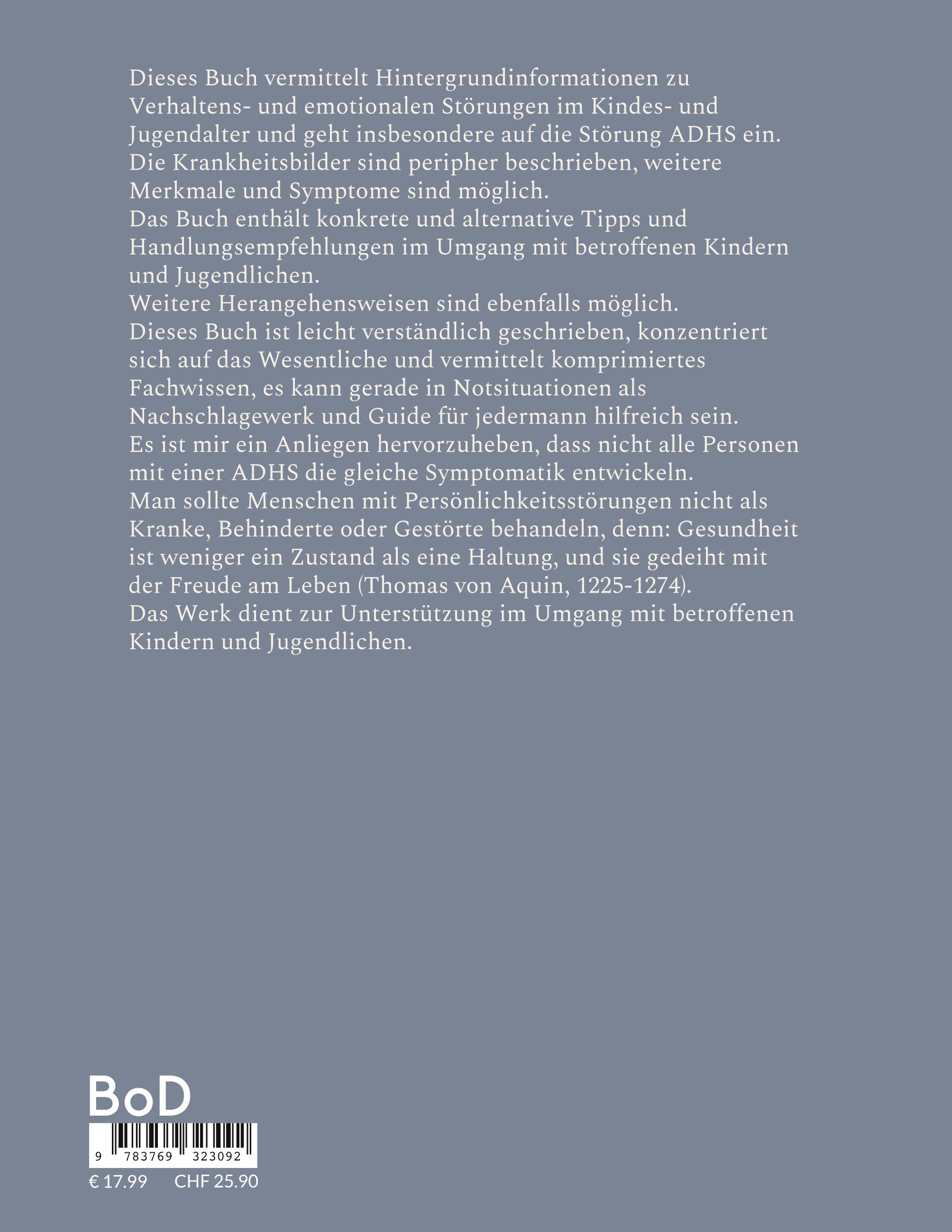Dieses Buch vermittelt Hintergrundinformationen zu Verhaltens- und emotionalen Störungen im Kinder- und Jugendalter und geht insbesondere auf die Störungen ADS, ADHS ein.