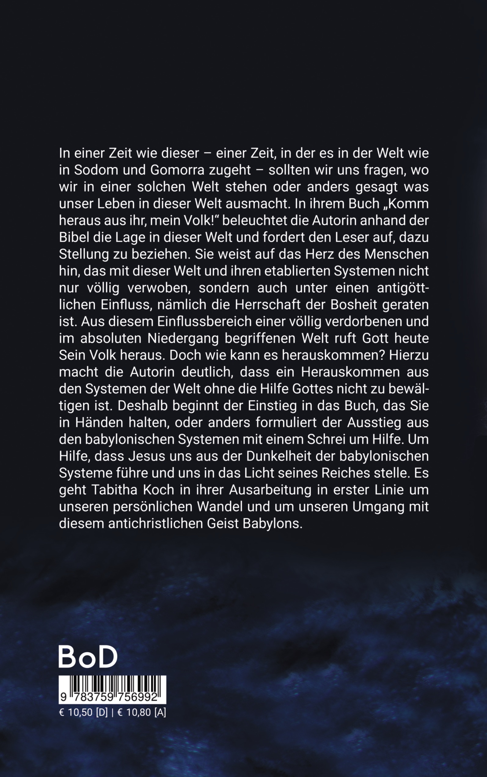 In einer Zeit wie dieser – einer Zeit, in der es in der Welt wie Sodom und Gomorra zugeht – sollten wir uns fragen, wo wir in einer solchen Welt stehen oder anders gesagt was unser Leben in dieser Welt ausmacht. In ihrem Buch „Komm heraus aus ihr, mein Volk!“ beleuchtet die Autorin anhand der Bibel die Lage in dieser Welt und fordert den Leser auf, dazu Stellung zu beziehen. Sie weist auf das Herz des Menschen hin, das mit dieser Welt und ihren etablierten Systemen nicht nur völlig verwoben, sondern auch unter einen antigöttlichen Einfluss, nämlich die Herrschaft der Bosheit geraten ist. Aus diesem Einflussbereich einer völlig verdorbenen und im absoluten Niedergang begriffenen Welt ruft Gott heute Sein Volk heraus. Doch wie kann es herauskommen? Hierzu macht die Autorin deutlich, dass ein Herauskommen aus den Systemen der Welt ohne die Hilfe Gottes nicht zu bewältigen ist. Deshalb beginnt der Einstieg in das Buch, das sie in Händen halten, oder anders formuliert der Ausstieg aus den babylonischen Systemen mit einem Schrei um Hilfe. Um Hilfe, dass Jesus uns aus der Dunkelheit der babylonischen Systeme führe und uns in das Licht seines Reiches stelle. Es geht Tabitha Koch in ihrer Ausarbeitung in erster Linie um unseren persönlichen Wandel und um unseren Umgang mit diesem antichristlichen Geist Babylons.