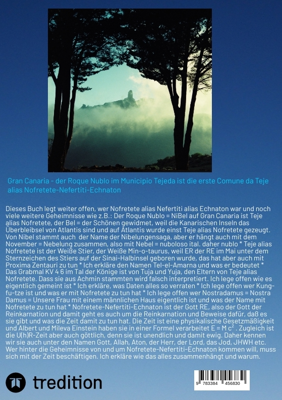 Dieses Buch legt weiter offen, wer Nofretete alias Nefertiti alias Echnaton war und noch viele weitere Geheimnisse:Der Vater Yuja/Onuris von Nofretete alias Teje stammte von Proxima-Centauri und Nofretete ist der Weiße Stier, der Min-o-taurus, auch weil sie unter dem Sternzeichen des Stiers im Wonnemonat Mai auf der Sinai-Halbinsel geboren wurde * Die Zeitrechnung der Centauren ist in Cento = 100 * Tel-el-Amarna = A-Mama * Das Grabmal KV 46 im Tal der Könige ist von Tuja und Yuja, den Eltern von Nofretete, die aber nicht aus Achmin stammten * Der Name Benjamin alias Ben aus Achmin * Nofretete ist der "Berg" * Die Barke des RE = Nofretete-Echnaton ist ein Raumschiff + zugleich die Bundeslade * Die Gene von Nofretete-Echnaton in unserer Seele = Zelle * Homöopathie - Schwingung kann nur mit Schwingung geheilt werden * Tinnitus - du hörst die Zeit in dir * Nostradamus = Nostra Dam = Unsere Frau = Nofretete * Benjamin - Imhotep - Sesostris I. * Dr. Georg und Walter Benjamin waren die Nachkommen der Is-Ra-Eliten, wurden aber einfach als Juden abgestempelt * "Angelus Novus" = der "Neue Engel" des "Löwen" von Paul Klee * Seth aus dem Osiris-Mythos war Hitler, auch bekannt als Herodes-Anti-Pas * Troja ist Auaris/Avaris und der Trojaner "Paris" ist Seth, der die schöne "Helena" raubte * Semiten + Semitismus und Antisemiten + Antisemitismus * Moses und der "Stock", dem er dem "falschen" Pharao Seth alias Herodes Anti-Pas zu Füßen legte * Am Anfang war das Wort und seine Bedeutung * Das System der Göttlichkeit * Zeit-Haus = Zeit-Pyramide = 12 Zeiten auf Basis der physikalischen Trinität * Jesus = das Je-su(s) = Ich gehe rauf mit meiner Seele * Hermeneutischer Zirkel * Das Haus des "KA" ist das Zeit-Haus unserer Seele * Wer hinter die Geheimnisse von und um Nofretete-Nefertiti-Echnaton kommen will, muss sich mit der Zeit beschäftigen - Ich erkläre wie das alles zusammenhängt und warum * Amsterdammertje" und Nofretete * Tierversuche sind ein Verbrechen gegen die Göttlichkeit * Die Dinge wiederholen sich, damit die junge Menschheit dieser Erde lernt