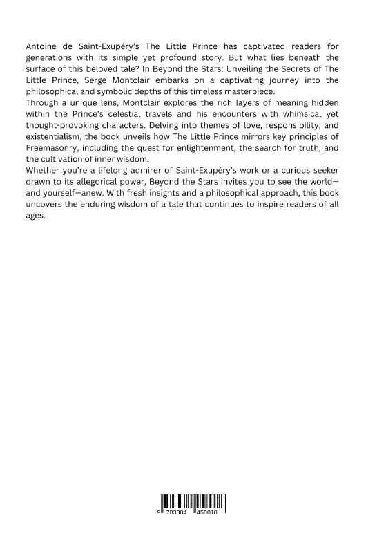 Antoine de Saint-Exupéry's The Little Prince has captivated readers for generations with its simple yet profound story. But what lies beneath the surface of this beloved tale? In Beyond the Stars: Unveiling the Secrets of The Little Prince, Serge Montclair embarks on a captivating journey into the philosophical and symbolic depths of this timeless mas-terpiece.Through a unique lens, Montclair explores the rich layers of meaning hidden within the Prince's celestial travels and his encounters with whimsical yet thought-provoking char-acters. Delving into themes of love, responsibility, and existentialism, the book unveils how The Little Prince mirrors key principles of Freemasonry, including the quest for en-lightenment, the search for truth, and the cultivation of inner wisdom.Whether you're a lifelong admirer of Saint-Exupéry's work or a curious seeker drawn to its allegorical power, Beyond the Stars invites you to see the world-and yourself-anew. With fresh insights and a philosophical approach, this book uncovers the enduring wis-dom of a tale that continues to inspire readers of all ages.