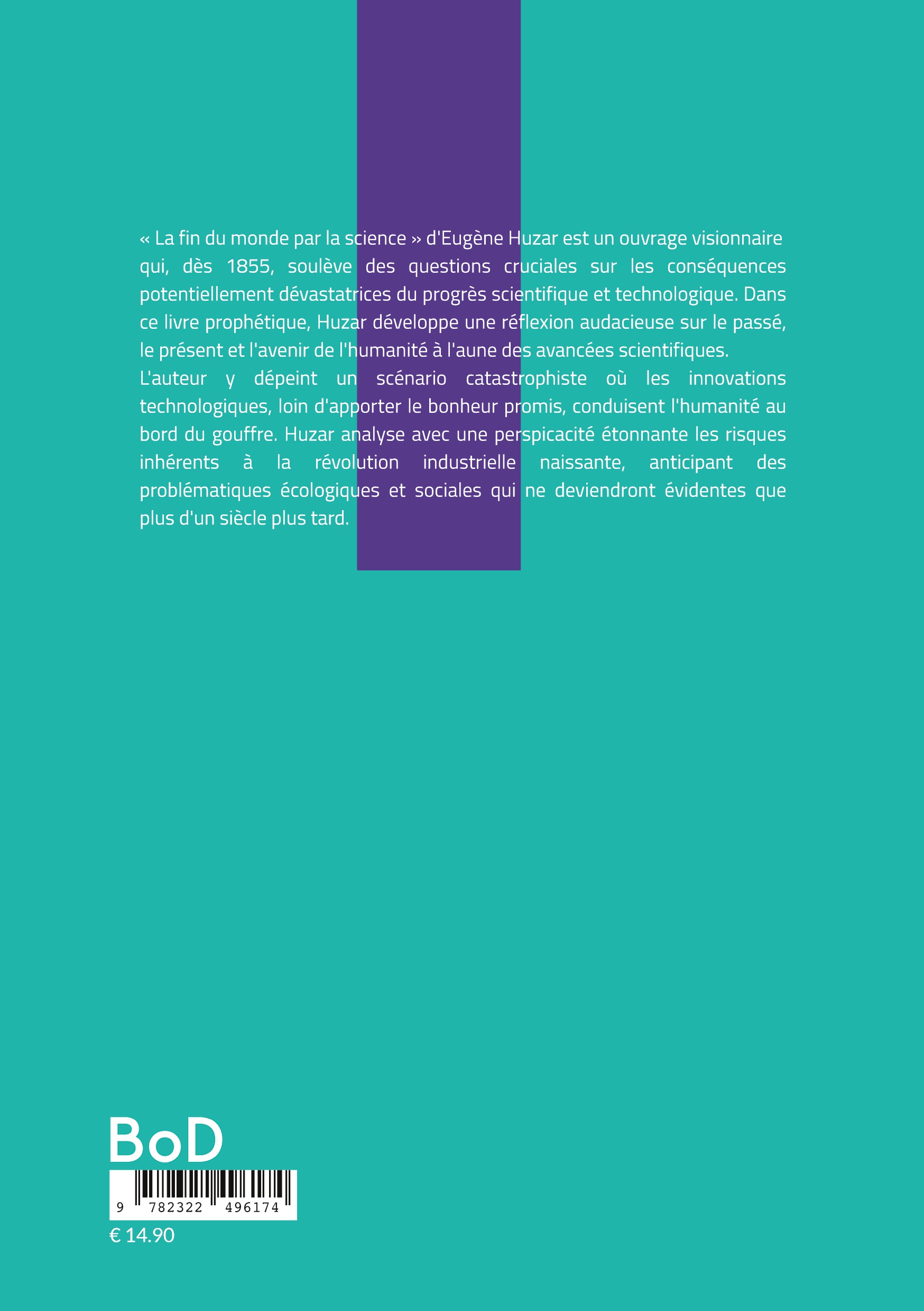 Eugène Huzar (1820-1890) fut un penseur visionnaire et un précurseur méconnu de l'écologie politique. Né à Mirecourt dans les Vosges, il développa très tôt un intérêt pour les sciences et leurs implications sociales et environnementales. Ingénieur de formation, Huzar se distingue par sa capacité à anticiper les conséquences à long terme du progrès technologique. Son oeuvre majeure, « La fin du monde par la science », publiée en 1855, témoigne d'une anticipation écologique remarquable, bien avant que les questions environnementales ne deviennent un enjeu majeur. La pensée d'Huzar se caractérise par une approche critique du progrès, remettant en question l'optimisme scientifique de son époque. Son futurisme philosophique, ancré dans une observation lucide des transformations induites par la révolution industrielle, lui permet de formuler des prévisions environnementales d'une étonnante justesse. Bien que largement ignoré de son vivant, Huzar est aujourd'hui reconnu comme un pionnier de la réflexion sur l'éthique scientifique et les limites du progrès. Ses écrits, redécouverts au XXe siècle, ont influencé de nombreux penseurs écologistes et critiques de la modernité. L'héritage d'Eugène Huzar réside dans sa capacité à avoir anticipé, plus d'un siècle à l'avance, les défis écologiques et éthiques posés par le développement technologique. Son oeuvre continue d'inspirer ceux qui cherchent à concilier progrès scientifique et préservation de l'environnement.