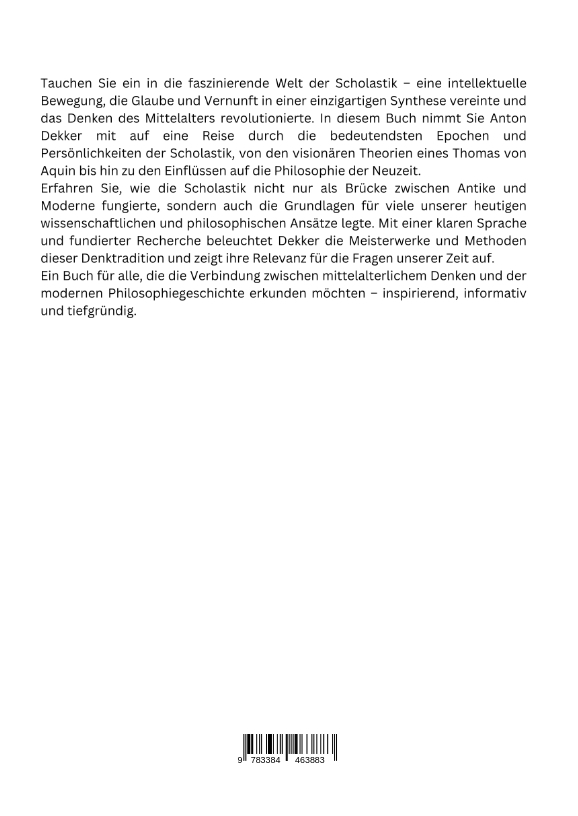 Tauchen Sie ein in die faszinierende Welt der Scholastik - eine intellektuelle Bewegung, die Glaube und Vernunft in einer einzigartigen Synthese vereinte und das Denken des Mittelalters revolutionierte. In diesem Buch nimmt Sie Anton Dekker mit auf eine Reise durch die bedeutendsten Epochen und Persönlichkeiten der Scholastik, von den visionären Theorien eines Thomas von Aquin bis hin zu den Einflüssen auf die Philosophie der Neuzeit.Erfahren Sie, wie die Scholastik nicht nur als Brücke zwischen Antike und Moderne fungierte, sondern auch die Grundlagen für viele unserer heutigen wissenschaftlichen und philosophischen Ansätze legte. Mit einer klaren Sprache und fundierter Recherche beleuchtet Dekker die Meisterwerke und Methoden dieser Denktradition und zeigt ihre Relevanz für die Fragen unserer Zeit auf.Ein Buch für alle, die die Verbindung zwischen mittelalterlichem Denken und der modernen Philosophiegeschichte erkunden möchten - inspirierend, informativ und tiefgründig.