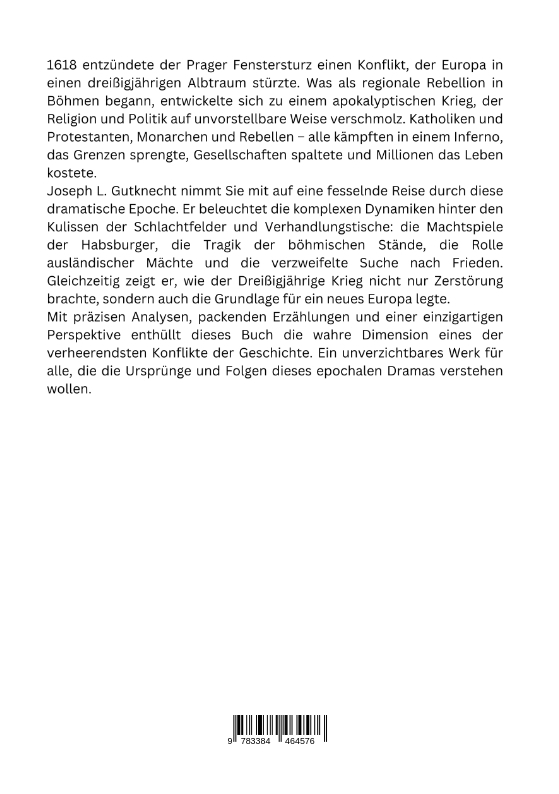 1618 entzündete der Prager Fenstersturz einen Konflikt, der Europa in einen dreißigjährigen Albtraum stürzte. Was als regionale Rebellion in Böhmen begann, entwickelte sich zu einem apokalyptischen Krieg, der Religion und Politik auf unvorstellbare Weise verschmolz. Katholiken und Protestanten, Monarchen und Rebellen - alle kämpften in einem Inferno, das Grenzen sprengte, Gesellschaften spaltete und Millionen das Leben kostete.Joseph L. Gutknecht nimmt Sie mit auf eine fesselnde Reise durch diese dramatische Epoche. Er beleuchtet die komplexen Dynamiken hinter den Kulissen der Schlachtfelder und Verhandlungstische: die Machtspiele der Habsburger, die Tragik der böhmischen Stände, die Rolle ausländischer Mächte und die verzweifelte Suche nach Frieden. Gleichzeitig zeigt er, wie der Dreißigjährige Krieg nicht nur Zerstörung brachte, sondern auch die Grundlage für ein neues Europa legte.Mit präzisen Analysen, packenden Erzählungen und einer einzigartigen Perspektive enthüllt dieses Buch die wahre Dimension eines der verheerendsten Konflikte der Geschichte. Ein unverzichtbares Werk für alle, die die Ursprünge und Folgen dieses epochalen Dramas verstehen wollen.