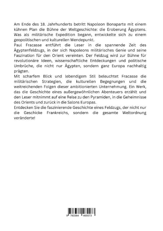 Am Ende des 18. Jahrhunderts betritt Napoleon Bonaparte mit einem kühnen Plan die Bühne der Weltgeschichte: die Eroberung Ägyptens. Was als militärische Expedition begann, entwickelte sich zu einem geopolitischen und kulturellen Wendepunkt.Paul Fracasse entführt die Leser in die spannende Zeit des Ägyptenfeldzugs, in der sich Napoleons militärisches Genie und seine Faszination für den Orient vereinten. Der Feldzug wird zur Bühne für revolutionäre Ideen, wissenschaftliche Entdeckungen und politische Umbrüche, die nicht nur Ägypten, sondern ganz Europa nachhaltig prägten.Mit scharfem Blick und lebendigem Stil beleuchtet Fracasse die militärischen Strategien, die kulturellen Begegnungen und die weitreichenden Folgen dieser ambitionierten Unternehmung. Ein Werk, das die Geschichte eines außergewöhnlichen Abenteuers erzählt und den Leser mitnimmt auf eine Reise zu den Pyramiden, in die Geheimnisse des Orients und zurück in die Salons Europas.Entdecken Sie die faszinierende Geschichte eines Feldzugs, der nicht nur die Geschicke Frankreichs, sondern die gesamte Weltordnung veränderte!