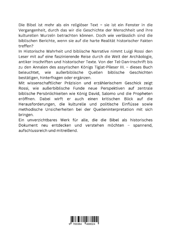 Die Bibel ist mehr als ein religiöser Text - sie ist ein Fenster in die Vergangenheit, durch das wir die Geschichte der Menschheit und ihre kulturellen Wurzeln betrachten können. Doch wie verlässlich sind die biblischen Berichte, wenn sie auf die harte Realität historischer Fakten treffen?In Historische Wahrheit und biblische Narrative nimmt Luigi Rossi den Leser mit auf eine faszinierende Reise durch die Welt der Archäologie, antiker Inschriften und historischer Texte. Von der Tel-Dan-Inschrift bis zu den Annalen des assyrischen Königs Tiglat-Pileser III. - dieses Buch beleuchtet, wie außerbiblische Quellen biblische Geschichten bestätigen, hinterfragen oder ergänzen.Mit wissenschaftlicher Präzision und erzählerischem Geschick zeigt Rossi, wie außer-biblische Funde neue Perspektiven auf zentrale biblische Persönlichkeiten wie König David, Salomo und die Propheten eröffnen. Dabei wirft er auch einen kritischen Blick auf die Herausforderungen, die kulturelle und politische Einflüsse sowie methodische Unsicherheiten bei der Quelleninterpretation mit sich bringen.Ein unverzichtbares Werk für alle, die die Bibel als historisches Dokument neu entdecken und verstehen möchten - spannend, aufschlussreich und mitreißend.