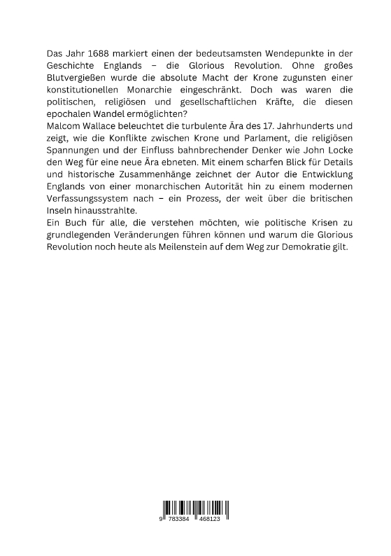 Das Jahr 1688 markiert einen der bedeutsamsten Wendepunkte in der Geschichte Englands - die Glorious Revolution. Ohne großes Blutvergießen wurde die absolute Macht der Krone zugunsten einer konstitutionellen Monarchie eingeschränkt. Doch was waren die politischen, religiösen und gesellschaftlichen Kräfte, die diesen epochalen Wandel ermöglichten?Malcom Wallace beleuchtet die turbulente Ära des 17. Jahrhunderts und zeigt, wie die Konflikte zwischen Krone und Parlament, die religiösen Spannungen und der Einfluss bahnbrechender Denker wie John Locke den Weg für eine neue Ära ebneten. Mit einem scharfen Blick für Details und historische Zusammenhänge zeichnet der Autor die Entwicklung Englands von einer monarchischen Autorität hin zu einem modernen Verfassungssystem nach - ein Prozess, der weit über die britischen Inseln hinausstrahlte.Ein Buch für alle, die verstehen möchten, wie politische Krisen zu grundlegenden Veränderungen führen können und warum die Glorious Revolution noch heute als Meilenstein auf dem Weg zur Demokratie gilt.