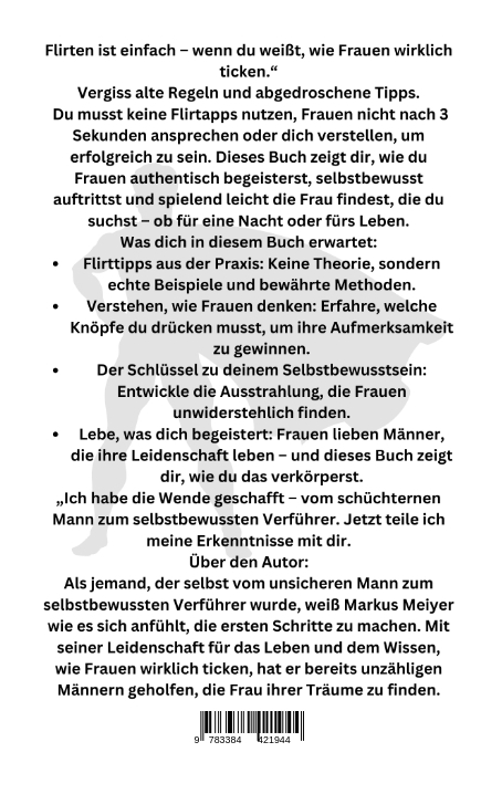Seine ungeschönte Art, Geschichten und Tipps zu teilen, macht ihn zu einem authentischen Begleiter für Leser, die bereit sind, ihre Komfortzone zu verlassen und das Beste aus sich herauszuholen. Markus Meiyer glaubt fest daran, dass jeder Mann die Fähigkeit besitzt, Frauen zu begeistern – nicht durch Tricks, sondern durch Authentizität, Mut und positive Energie.