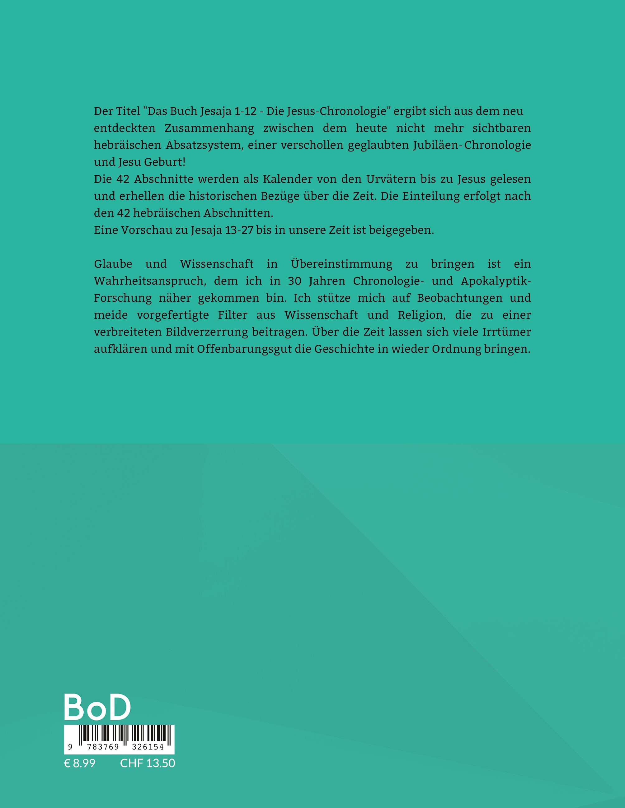 Der Titel "Das Buch Jesaja 1-12 - Die Jesus-Chronologie" ergibt sich aus dem neu entdeckten Zusammenhang zwischen dem heute nicht mehr sichtbaren hebräischen Absatzsystem, eine verschollen geglaubte Jubiläen-Chronologie und Jesu Geburt!