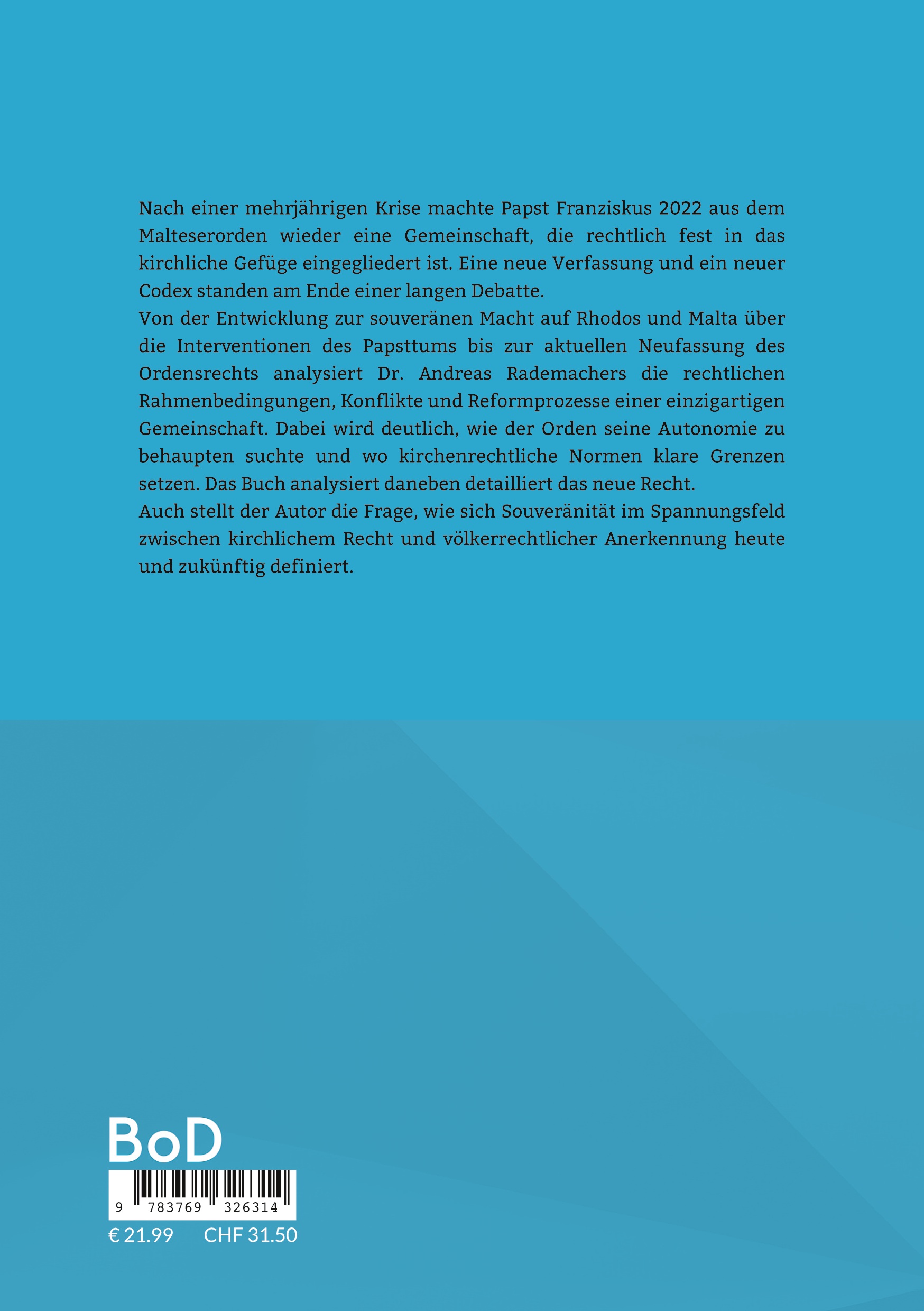 Von der Entwicklung zur souveränen Macht auf Rhodos und Malta über die Interventionen des Papsttums bis zur aktuellen Neufassung des Ordensrechts im Jahr 2022 analysiert Dr. Andreas Rademachers die rechtlichen Rahmenbedingungen, Konflikte und Reformprozesse einer einzigartigen Gemeinschaft. Dabei wird deutlich, wie der Orden seine Autonomie zu behaupten suchte und wo kirchenrechtliche Normen klare Grenzen setzen. Das Buch analysiert daneben detailliert das neue Recht.