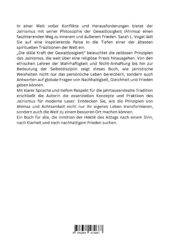 In einer Welt voller Konflikte und Herausforderungen bietet der Jainismus mit seiner Philosophie der Gewaltlosigkeit (Ahimsa) einen faszinierenden Weg zu innerem und äußerem Frieden. Sarah L. Vogel lädt Sie auf eine inspirierende Reise in die Tiefen einer der ältesten spirituellen Traditionen der Welt ein."Die stille Kraft der Gewaltlosigkeit" beleuchtet die zeitlosen Prinzipien des Jainismus, die weit über eine religiöse Praxis hinausgehen. Von den ethischen Lehren der Wahrhaftigkeit und Nicht-Anhaftung bis hin zur Bedeutung der Selbstdisziplin zeigt dieses Buch, wie jainistische Weisheiten nicht nur das persönliche Leben bereichern, sondern auch Antworten auf globale Fragen von Nachhaltigkeit, Gleichheit und Frieden geben können.Mit klarer Sprache und tiefem Respekt für die jahrtausendealte Tradition erschließt die Autorin die essenziellen Konzepte und Praktiken des Jainismus für moderne Leser. Entdecken Sie, wie die Prinzipien von Ahimsa und Achtsamkeit nicht nur Ihr eigenes Leben transformieren, sondern auch die Welt zu einem besseren Ort machen können.Ein Buch für alle, die inmitten der Hektik des Alltags nach einem Sinn, nach Klarheit und nach nachhaltigem Frieden suchen.