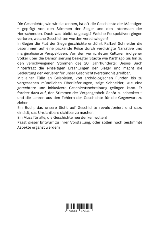 | Schlagworte | alternative Narrative • Historische Verzerrung • Karthago und Rom • Koloniale Narrative • Marginalisierte Perspektiven • Perspektivenwechsel • Stimmen der Unterdrückten • Verborgene Geschichte • Vergessene Kulturen • Verlierer der Geschichte |