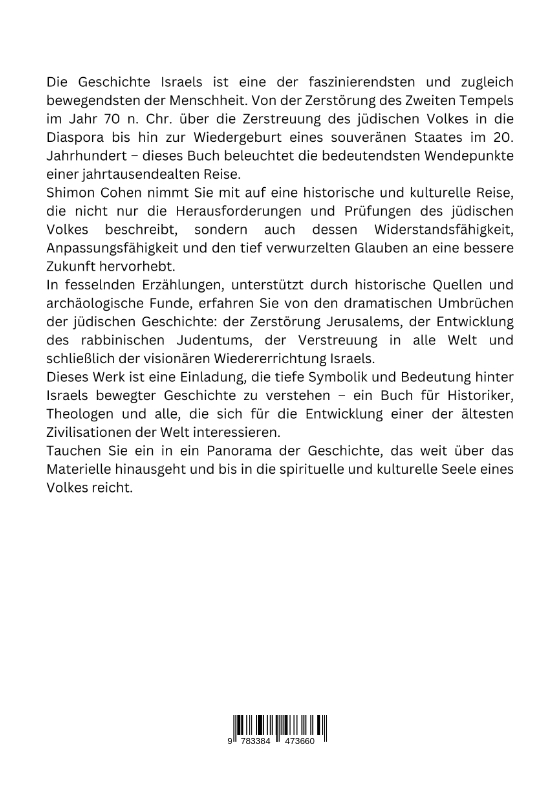 Die Geschichte Israels ist eine der faszinierendsten und zugleich bewegendsten der Menschheit. Von der Zerstörung des Zweiten Tempels im Jahr 70 n. Chr. über die Zerstreuung des jüdischen Volkes in die Diaspora bis hin zur Wiedergeburt eines souveränen Staates im 20. Jahrhundert - dieses Buch beleuchtet die bedeutendsten Wendepunkte einer jahrtausendealten Reise.Shimon Cohen nimmt Sie mit auf eine historische und kulturelle Reise, die nicht nur die Herausforderungen und Prüfungen des jüdischen Volkes beschreibt, sondern auch dessen Widerstandsfähigkeit, Anpassungsfähigkeit und den tief verwurzelten Glauben an eine bessere Zukunft hervorhebt.In fesselnden Erzählungen, unterstützt durch historische Quellen und archäologische Funde, erfahren Sie von den dramatischen Umbrüchen der jüdischen Geschichte: der Zerstörung Jerusalems, der Entwicklung des rabbinischen Judentums, der Verstreuung in alle Welt und schließlich der visionären Wiedererrichtung Israels.Dieses Werk ist eine Einladung, die tiefe Symbolik und Bedeutung hinter Israels bewegter Geschichte zu verstehen - ein Buch für Historiker, Theologen und alle, die sich für die Entwicklung einer der ältesten Zivilisationen der Welt interessieren.Tauchen Sie ein in ein Panorama der Geschichte, das weit über das Materielle hinaus-geht und bis in die spirituelle und kulturelle Seele eines Volkes reicht.