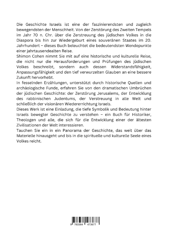Die Geschichte Israels ist eine der faszinierendsten und zugleich bewegendsten der Menschheit. Von der Zerstörung des Zweiten Tempels im Jahr 70 n. Chr. über die Zerstreuung des jüdischen Volkes in die Diaspora bis hin zur Wiedergeburt eines souveränen Staates im 20. Jahrhundert - dieses Buch beleuchtet die bedeutendsten Wendepunkte einer jahrtausendealten Reise.Shimon Cohen nimmt Sie mit auf eine historische und kulturelle Reise, die nicht nur die Herausforderungen und Prüfungen des jüdischen Volkes beschreibt, sondern auch dessen Widerstandsfähigkeit, Anpassungsfähigkeit und den tief verwurzelten Glauben an eine bessere Zukunft hervorhebt.In fesselnden Erzählungen, unterstützt durch historische Quellen und archäologische Funde, erfahren Sie von den dramatischen Umbrüchen der jüdischen Geschichte: der Zerstörung Jerusalems, der Entwicklung des rabbinischen Judentums, der Verstreuung in alle Welt und schließlich der visionären Wiedererrichtung Israels.Dieses Werk ist eine Einladung, die tiefe Symbolik und Bedeutung hinter Israels bewegter Geschichte zu verstehen - ein Buch für Historiker, Theologen und alle, die sich für die Entwicklung einer der ältesten Zivilisationen der Welt interessieren.Tauchen Sie ein in ein Panorama der Geschichte, das weit über das Materielle hinaus-geht und bis in die spirituelle und kulturelle Seele eines Volkes reicht.