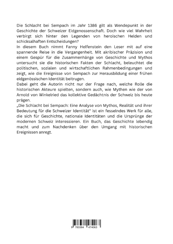 Die Schlacht bei Sempach im Jahr 1386 gilt als Wendepunkt in der Geschichte der Schweizer Eidgenossenschaft. Doch wie viel Wahrheit verbirgt sich hinter den Legenden von heroischen Helden und schicksalhaften Entscheidungen?In diesem Buch nimmt Fanny Helfenstein den Leser mit auf eine spannende Reise in die Vergangenheit. Mit akribischer Präzision und einem Gespür für die Zusammenhänge von Geschichte und Mythos untersucht sie die historischen Fakten der Schlacht, beleuchtet die politischen, sozialen und wirtschaftlichen Rahmenbedingungen und zeigt, wie die Ereignisse von Sempach zur Herausbildung einer frühen eidgenössischen Identität bei-trugen.Dabei geht die Autorin nicht nur der Frage nach, welche Rolle die historischen Akteure spielten, sondern auch, wie Mythen wie der von Arnold von Winkelried das kollektive Gedächtnis der Schweiz bis heute prägen."Die Schlacht bei Sempach: Eine Analyse von Mythos, Realität und ihrer Bedeutung für die Schweizer Identität" ist ein fesselndes Werk für alle, die sich für Geschichte, nationale Identitäten und die Ursprünge der modernen Schweiz interessieren. Ein Buch, das Ge-schichte lebendig macht und zum Nachdenken über den Umgang mit historischen Ereignissen anregt.