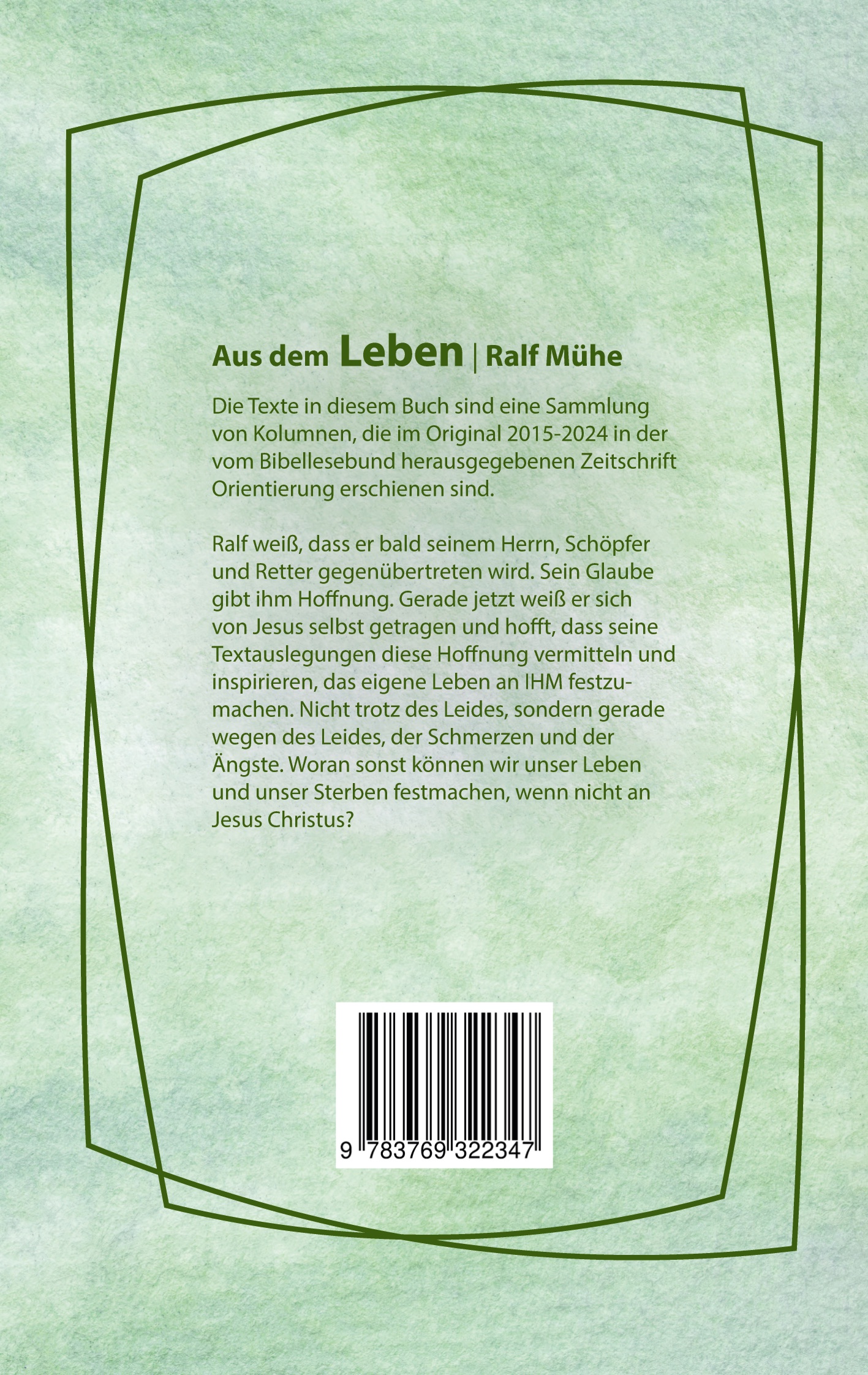 Ralf weiß, dass er bald seinem Herrn, Schöpfer und Retter gegenübertreten wird. Sein Glaube gibt ihm Hoffnung. Gerade jetzt weiß er sich von Jesus selbst getragen und hofft, dass seine Textauslegungen diese Hoffnung vermitteln und inspirieren, das eigene Leben an IHM festzumachen. Nicht trotz des Leides, sondern gerade wegen des Leides, der Schmerzen und der Ängste. Woran sonst können wir unser Leben und unser Sterben festmachen, wenn nicht an Jesus Christus?