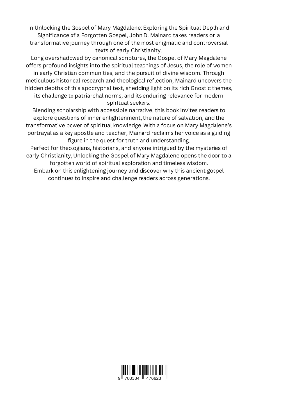 In Unlocking the Gospel of Mary Magdalene: Exploring the Spiritual Depth and Significance of a Forgotten Gospel, John D. Mainard takes readers on a transformative journey through one of the most enigmatic and controversial texts of early Christianity.Long overshadowed by canonical scriptures, the Gospel of Mary Magdalene offers profound insights into the spiritual teachings of Jesus, the role of women in early Christian communities, and the pursuit of divine wisdom. Through meticulous historical research and theological reflection, Mainard uncovers the hidden depths of this apocryphal text, shedding light on its rich Gnostic themes, its challenge to patriarchal norms, and its enduring relevance for modern spiritual seekers.Blending scholarship with accessible narrative, this book invites readers to explore questions of inner enlightenment, the nature of salvation, and the transformative power of spiritual knowledge. With a focus on Mary Magdalene's portrayal as a key apostle and teacher, Mainard reclaims her voice as a guiding figure in the quest for truth and understanding.Perfect for theologians, historians, and anyone intrigued by the mysteries of early Christianity, Unlocking the Gospel of Mary Magdalene opens the door to a forgotten world of spiritual exploration and timeless wisdom.Embark on this enlightening journey and discover why this ancient gospel continues to inspire and challenge readers across generations.