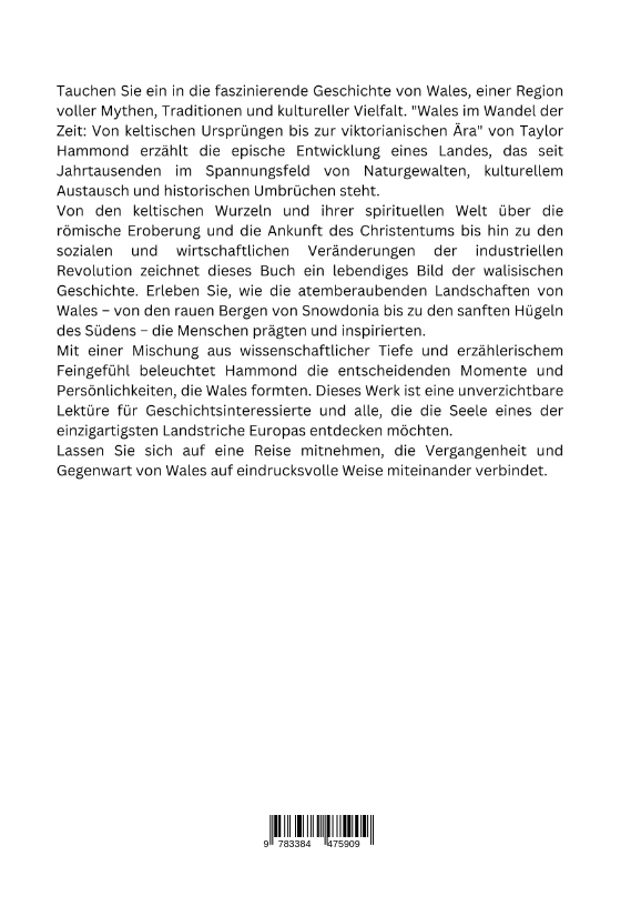 Tauchen Sie ein in die faszinierende Geschichte von Wales, einer Region voller Mythen, Traditionen und kultureller Vielfalt. "Wales im Wandel der Zeit: Von keltischen Ursprüngen bis zur viktorianischen Ära" von Taylor Hammond erzählt die epische Entwicklung eines Landes, das seit Jahrtausenden im Spannungsfeld von Naturgewalten, kulturellem Austausch und historischen Umbrüchen steht.Von den keltischen Wurzeln und ihrer spirituellen Welt über die römische Eroberung und die Ankunft des Christentums bis hin zu den sozialen und wirtschaftlichen Veränderungen der industriellen Revolution zeichnet dieses Buch ein lebendiges Bild der walisischen Geschichte. Erleben Sie, wie die atemberaubenden Landschaften von Wales - von den rauen Bergen von Snowdonia bis zu den sanften Hügeln des Südens - die Menschen prägten und inspirierten.Mit einer Mischung aus wissenschaftlicher Tiefe und erzählerischem Feingefühl beleuchtet Hammond die entscheidenden Momente und Persönlichkeiten, die Wales form-ten. Dieses Werk ist eine unverzichtbare Lektüre für Geschichtsinteressierte und alle, die die Seele eines der einzigartigsten Landstriche Europas entdecken möchten.Lassen Sie sich auf eine Reise mitnehmen, die Vergangenheit und Gegenwart von Wales auf eindrucksvolle Weise miteinander verbindet.