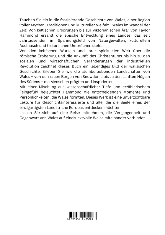 Tauchen Sie ein in die faszinierende Geschichte von Wales, einer Region voller Mythen, Traditionen und kultureller Vielfalt. "Wales im Wandel der Zeit: Von keltischen Ursprüngen bis zur viktorianischen Ära" von Taylor Hammond erzählt die epische Entwicklung eines Landes, das seit Jahrtausenden im Spannungsfeld von Naturgewalten, kulturellem Austausch und historischen Umbrüchen steht.Von den keltischen Wurzeln und ihrer spirituellen Welt über die römische Eroberung und die Ankunft des Christentums bis hin zu den sozialen und wirtschaftlichen Veränderungen der industriellen Revolution zeichnet dieses Buch ein lebendiges Bild der walisischen Geschichte. Erleben Sie, wie die atemberaubenden Landschaften von Wales - von den rauen Bergen von Snowdonia bis zu den sanften Hügeln des Südens - die Menschen prägten und inspirierten.Mit einer Mischung aus wissenschaftlicher Tiefe und erzählerischem Feingefühl beleuchtet Hammond die entscheidenden Momente und Persönlichkeiten, die Wales form-ten. Dieses Werk ist eine unverzichtbare Lektüre für Geschichtsinteressierte und alle, die die Seele eines der einzigartigsten Landstriche Europas entdecken möchten.Lassen Sie sich auf eine Reise mitnehmen, die Vergangenheit und Gegenwart von Wales auf eindrucksvolle Weise miteinander verbindet.