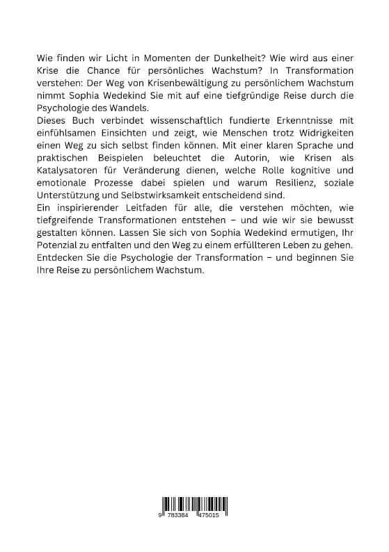 Wie finden wir Licht in Momenten der Dunkelheit? Wie wird aus einer Krise die Chance für persönliches Wachstum? In Transformation verstehen: Der Weg von Krisenbewältigung zu persönlichem Wachstum nimmt Sophia Wedekind Sie mit auf eine tiefgründige Reise durch die Psychologie des Wandels.Dieses Buch verbindet wissenschaftlich fundierte Erkenntnisse mit einfühlsamen Ein-sichten und zeigt, wie Menschen trotz Widrigkeiten einen Weg zu sich selbst finden können. Mit einer klaren Sprache und praktischen Beispielen beleuchtet die Autorin, wie Krisen als Katalysatoren für Veränderung dienen, welche Rolle kognitive und emotionale Prozesse dabei spielen und warum Resilienz, soziale Unterstützung und Selbstwirksamkeit entscheidend sind.Ein inspirierender Leitfaden für alle, die verstehen möchten, wie tiefgreifende Transformationen entstehen - und wie wir sie bewusst gestalten können. Lassen Sie sich von Sophia Wedekind ermutigen, Ihr Potenzial zu entfalten und den Weg zu einem erfüllteren Leben zu gehen.Entdecken Sie die Psychologie der Transformation - und beginnen Sie Ihre Reise zu persönlichem Wachstum.