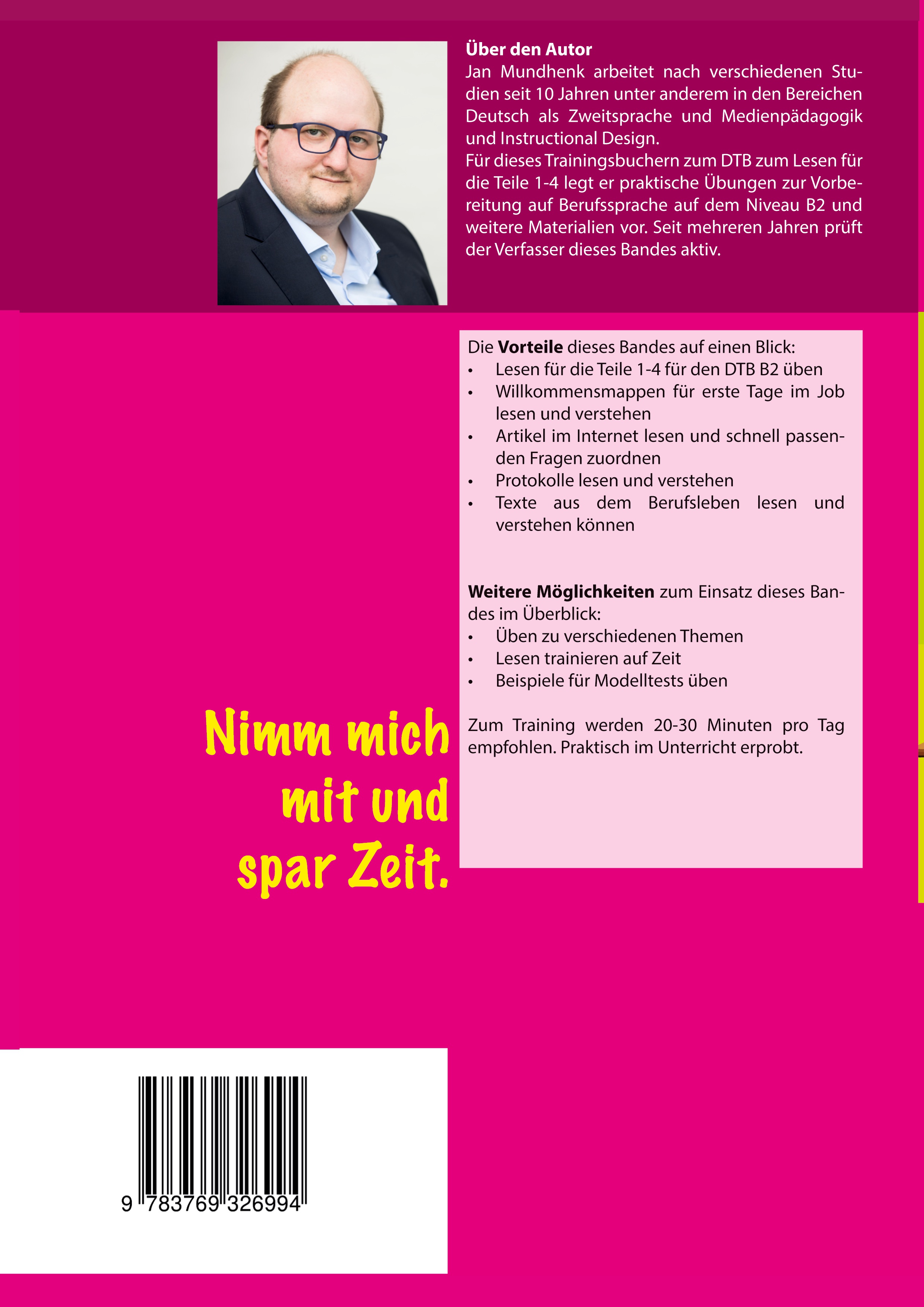 Jan Mundhenk arbeitet nach verschiedenen Studien seit 10 Jahren unter anderem in den Bereichen Deutsch als Zweitsprache und Medienpädagogik und Instructional Design. Für dieses Trainingsbuch zum DTB B2 für die Teile 1-4 des Subtests Lesen legt er praktische Übungen vor. Seit mehreren Jahren prüft der Verfasser dieses Bandes aktiv.