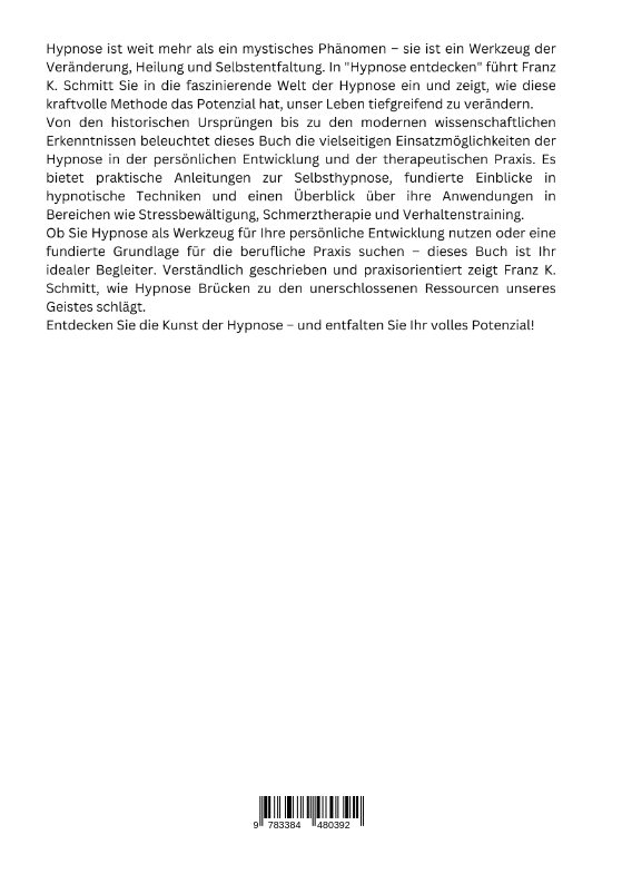 Hypnose ist weit mehr als ein mystisches Phänomen - sie ist ein Werkzeug der Veränderung, Heilung und Selbstentfaltung. In "Hypnose entdecken" führt Franz K. Schmitt Sie in die faszinierende Welt der Hypnose ein und zeigt, wie diese kraftvolle Methode das Potenzial hat, unser Leben tiefgreifend zu verändern.Von den historischen Ursprüngen bis zu den modernen wissenschaftlichen Erkenntnissen beleuchtet dieses Buch die vielseitigen Einsatzmöglichkeiten der Hypnose in der persönlichen Entwicklung und der therapeutischen Praxis. Es bietet praktische Anleitungen zur Selbsthypnose, fundierte Einblicke in hypnotische Techniken und einen Überblick über ihre Anwendungen in Bereichen wie Stressbewältigung, Schmerztherapie und Verhaltenstraining.Ob Sie Hypnose als Werkzeug für Ihre persönliche Entwicklung nutzen oder eine fundierte Grundlage für die berufliche Praxis suchen - dieses Buch ist Ihr idealer Begleiter. Verständlich geschrieben und praxisorientiert zeigt Franz K. Schmitt, wie Hypnose Brücken zu den unerschlossenen Ressourcen unseres Geistes schlägt.