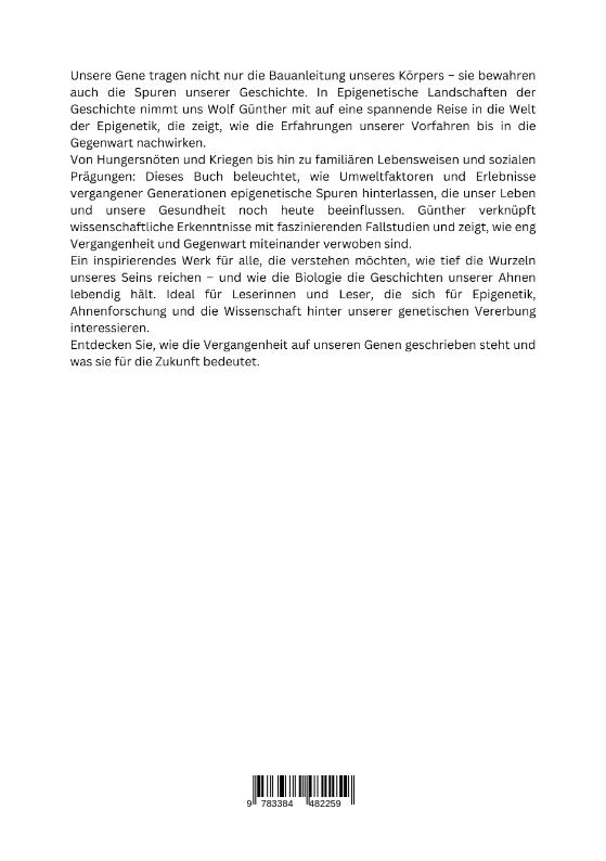Unsere Gene tragen nicht nur die Bauanleitung unseres Körpers - sie bewahren auch die Spuren unserer Geschichte. In Epigenetische Landschaften der Geschichte nimmt uns Wolf Günther mit auf eine spannende Reise in die Welt der Epigenetik, die zeigt, wie die Erfahrungen unserer Vorfahren bis in die Gegenwart nachwirken.Von Hungersnöten und Kriegen bis hin zu familiären Lebensweisen und sozialen Prägungen: Dieses Buch beleuchtet, wie Umweltfaktoren und Erlebnisse vergangener Generationen epigenetische Spuren hinterlassen, die unser Leben und unsere Gesundheit noch heute beeinflussen. Günther verknüpft wissenschaftliche Erkenntnisse mit faszinierenden Fallstudien und zeigt, wie eng Vergangenheit und Gegenwart miteinander verwoben sind.Ein inspirierendes Werk für alle, die verstehen möchten, wie tief die Wurzeln unseres Seins reichen - und wie die Biologie die Geschichten unserer Ahnen lebendig hält. Ideal für Leserinnen und Leser, die sich für Epigenetik, Ahnenforschung und die Wissenschaft hinter unserer genetischen Vererbung interessieren.Entdecken Sie, wie die Vergangenheit auf unseren Genen geschrieben steht und was sie für die Zukunft bedeutet.