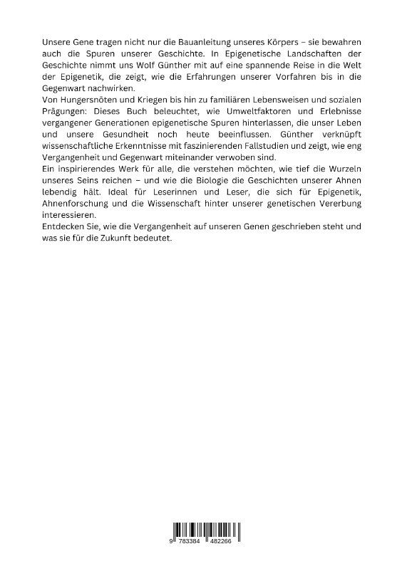 Unsere Gene tragen nicht nur die Bauanleitung unseres Körpers - sie bewahren auch die Spuren unserer Geschichte. In Epigenetische Landschaften der Geschichte nimmt uns Wolf Günther mit auf eine spannende Reise in die Welt der Epigenetik, die zeigt, wie die Erfahrungen unserer Vorfahren bis in die Gegenwart nachwirken.Von Hungersnöten und Kriegen bis hin zu familiären Lebensweisen und sozialen Prägungen: Dieses Buch beleuchtet, wie Umweltfaktoren und Erlebnisse vergangener Generationen epigenetische Spuren hinterlassen, die unser Leben und unsere Gesundheit noch heute beeinflussen. Günther verknüpft wissenschaftliche Erkenntnisse mit faszinierenden Fallstudien und zeigt, wie eng Vergangenheit und Gegenwart miteinander verwoben sind.Ein inspirierendes Werk für alle, die verstehen möchten, wie tief die Wurzeln unseres Seins reichen - und wie die Biologie die Geschichten unserer Ahnen lebendig hält. Ideal für Leserinnen und Leser, die sich für Epigenetik, Ahnenforschung und die Wissenschaft hinter unserer genetischen Vererbung interessieren.Entdecken Sie, wie die Vergangenheit auf unseren Genen geschrieben steht und was sie für die Zukunft bedeutet.