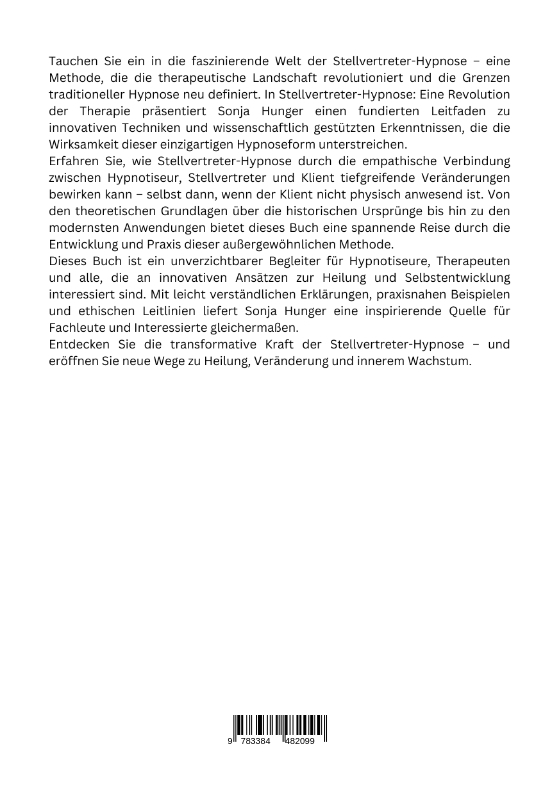 Tauchen Sie ein in die faszinierende Welt der Stellvertreter-Hypnose - eine Methode, die die therapeutische Landschaft revolutioniert und die Grenzen traditioneller Hypnose neu definiert. In Stellvertreter-Hypnose: Eine Revolution der Therapie präsentiert Sonja Hunger einen fundierten Leitfaden zu innovativen Techniken und wissenschaftlich gestützten Erkenntnissen, die die Wirksamkeit dieser einzigartigen Hypnoseform unterstreichen.Erfahren Sie, wie Stellvertreter-Hypnose durch die empathische Verbindung zwischen Hypnotiseur, Stellvertreter und Klient tiefgreifende Veränderungen bewirken kann - selbst dann, wenn der Klient nicht physisch anwesend ist. Von den theoretischen Grundlagen über die historischen Ursprünge bis hin zu den modernsten Anwendungen bietet dieses Buch eine spannende Reise durch die Entwicklung und Praxis dieser außergewöhnlichen Methode.Dieses Buch ist ein unverzichtbarer Begleiter für Hypnotiseure, Therapeuten und alle, die an innovativen Ansätzen zur Heilung und Selbstentwicklung interessiert sind. Mit leicht verständlichen Erklärungen, praxisnahen Beispielen und ethischen Leitlinien liefert Sonja Hunger eine inspirierende Quelle für Fachleute und Interessierte gleichermaßen.Entdecken Sie die transformative Kraft der Stellvertreter-Hypnose - und eröffnen Sie neue Wege zu Heilung, Veränderung und innerem Wachstum.