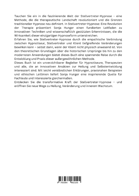 Tauchen Sie ein in die faszinierende Welt der Stellvertreter-Hypnose - eine Methode, die die therapeutische Landschaft revolutioniert und die Grenzen traditioneller Hypnose neu definiert. In Stellvertreter-Hypnose: Eine Revolution der Therapie präsentiert Sonja Hunger einen fundierten Leitfaden zu innovativen Techniken und wissenschaftlich gestützten Erkenntnissen, die die Wirksamkeit dieser einzigartigen Hypnoseform unterstreichen.Erfahren Sie, wie Stellvertreter-Hypnose durch die empathische Verbindung zwischen Hypnotiseur, Stellvertreter und Klient tiefgreifende Veränderungen bewirken kann - selbst dann, wenn der Klient nicht physisch anwesend ist. Von den theoretischen Grundlagen über die historischen Ursprünge bis hin zu den modernsten Anwendungen bietet dieses Buch eine spannende Reise durch die Entwicklung und Praxis dieser außergewöhnlichen Methode.Dieses Buch ist ein unverzichtbarer Begleiter für Hypnotiseure, Therapeuten und alle, die an innovativen Ansätzen zur Heilung und Selbstentwicklung interessiert sind. Mit leicht verständlichen Erklärungen, praxisnahen Beispielen und ethischen Leitlinien liefert Sonja Hunger eine inspirierende Quelle für Fachleute und Interessierte gleichermaßen.Entdecken Sie die transformative Kraft der Stellvertreter-Hypnose - und eröffnen Sie neue Wege zu Heilung, Veränderung und innerem Wachstum.
